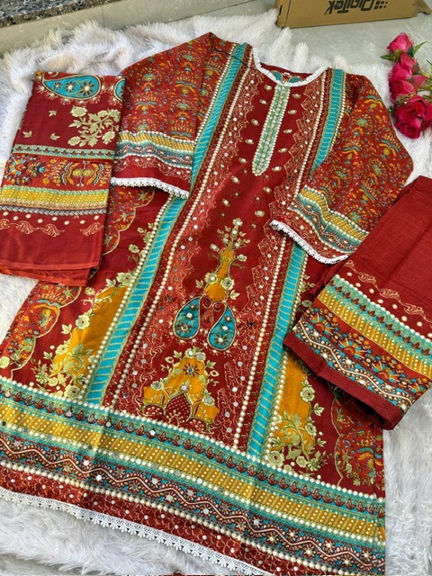 | DETAILS | **FABRIC DETAILS:- Top - *Cotton Digital Style Print with Neck handwork with mirror work - 2.60 mts* Bottom - *Cotton lawn printed - 2.25 mts* Dupatta - Cotton Mall - 2.35 mts |