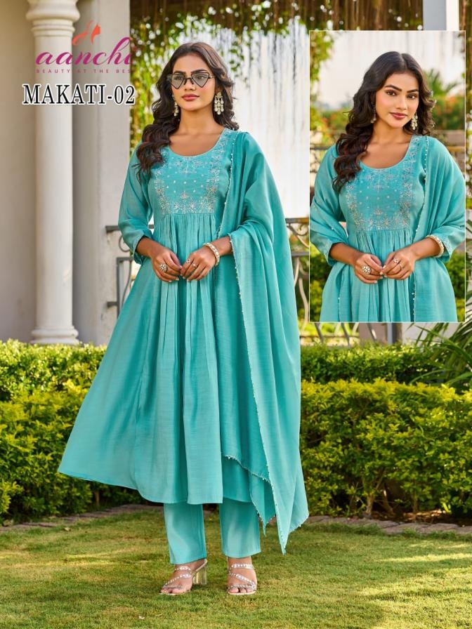 aanchi makati 01 & 02 mul chanderi wholesale readymade suit in surat suitable for both variety of styles and age groups. Can be made in different styles like Anarkali’s, sleek straight-cut suits, and classic salwar sets for every occasion. Whether you want it during your bride-to-be, a busy professional, or someone who loves ethnic wear, this designer suit makes you centre of extraction to everyone.
