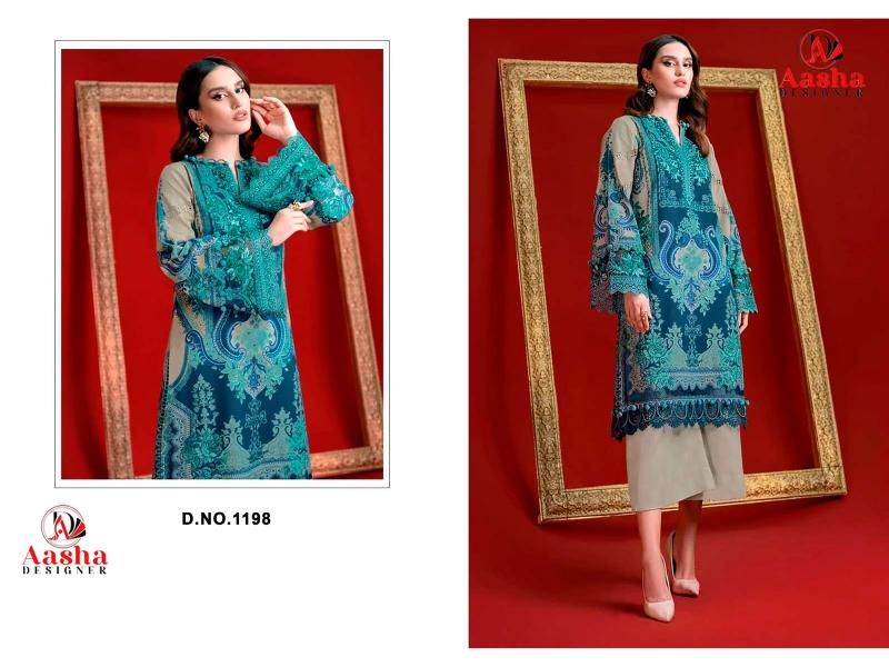 When it comes to traditional wear, quality truly plays and important role. Style never goes out of fashion. Aasha 1198 catalog Cotton Dupatta pakistani suits wholesalers in mumbai brings you a beautiful shade of style, design, and luxury that women have been loved for a long time.