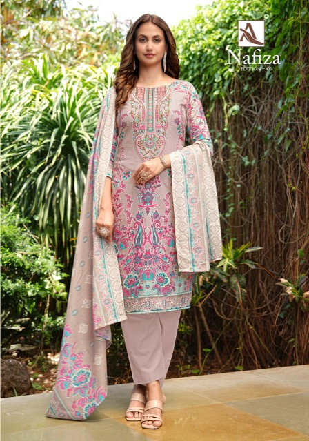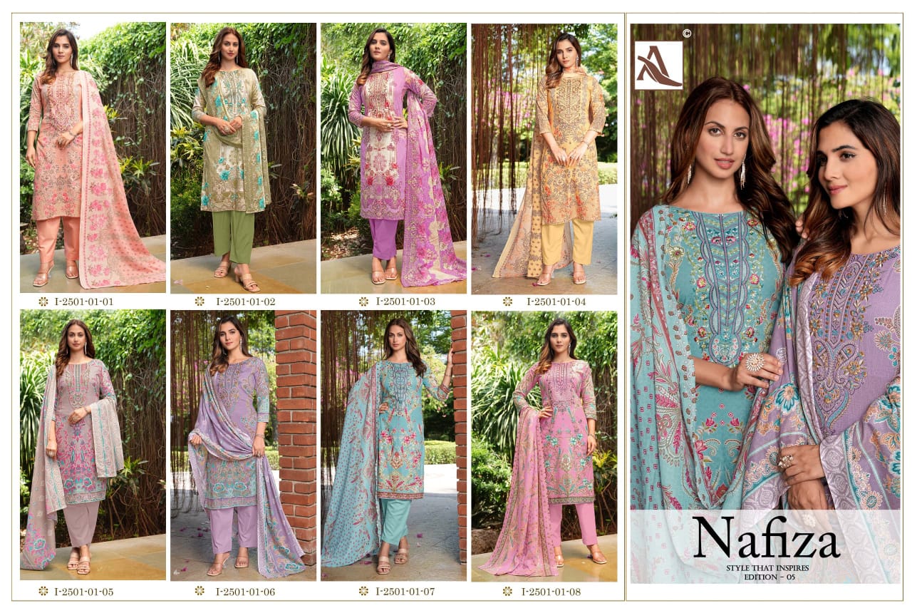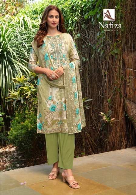 ALOK SUIT NAFIZA EDITION 5 contains superior Fabrics, with perfect craftsmanship makes it one most best quality suits catalogue. Best commitment to ungearing quality.