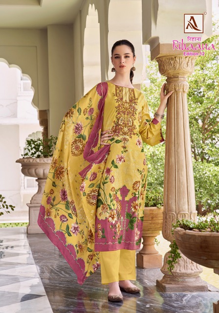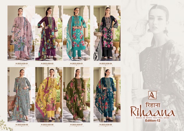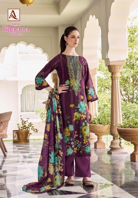ALOK SUIT RIHAANA EDITION 12 contains superior Fabrics, with perfect craftsmanship makes it one most best quality suits catalogue. Best commitment to ungearing quality.