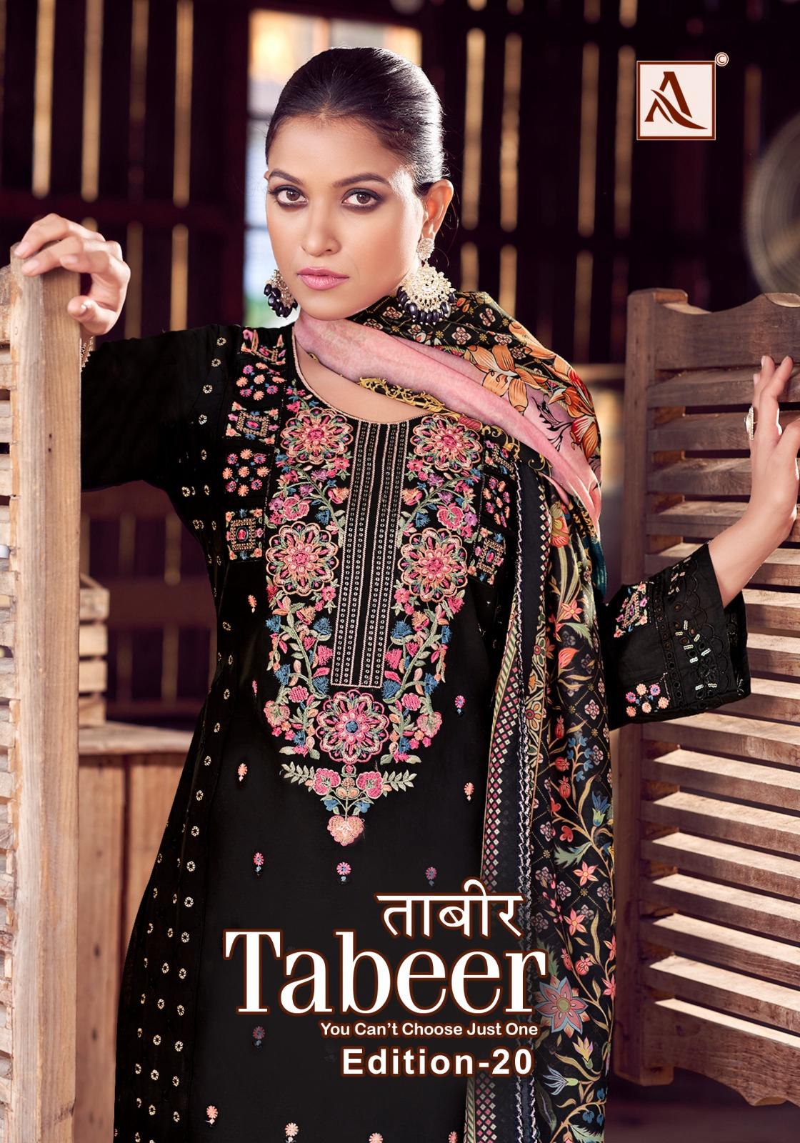 ALOK SUIT TABEER EDITION 20 contains superior Fabrics, with perfect craftsmanship makes it one most best quality suits catalogue. Best commitment to ungearing quality.