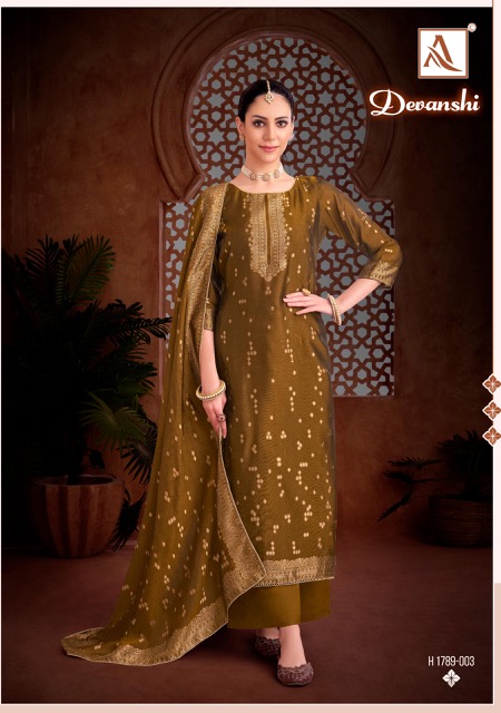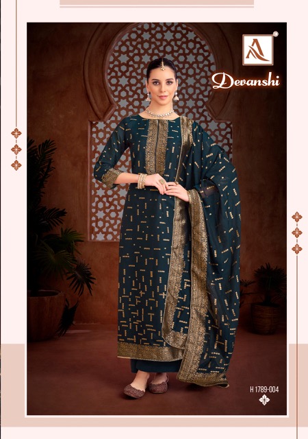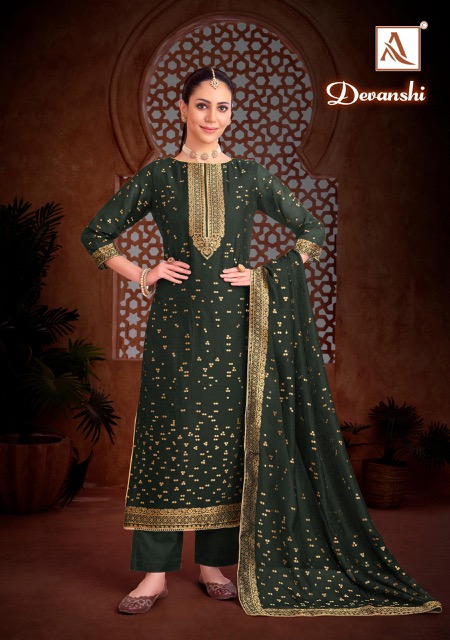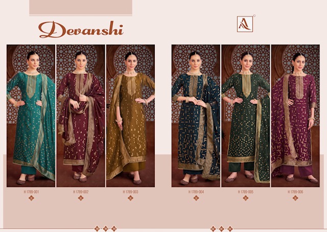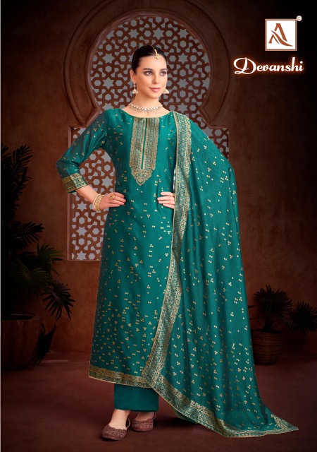 ALOK SUITS DEVANSHI contains superior Fabrics, with perfect craftsmanship makes it one most best quality suits catalogue. Best commitment to ungearing quality.