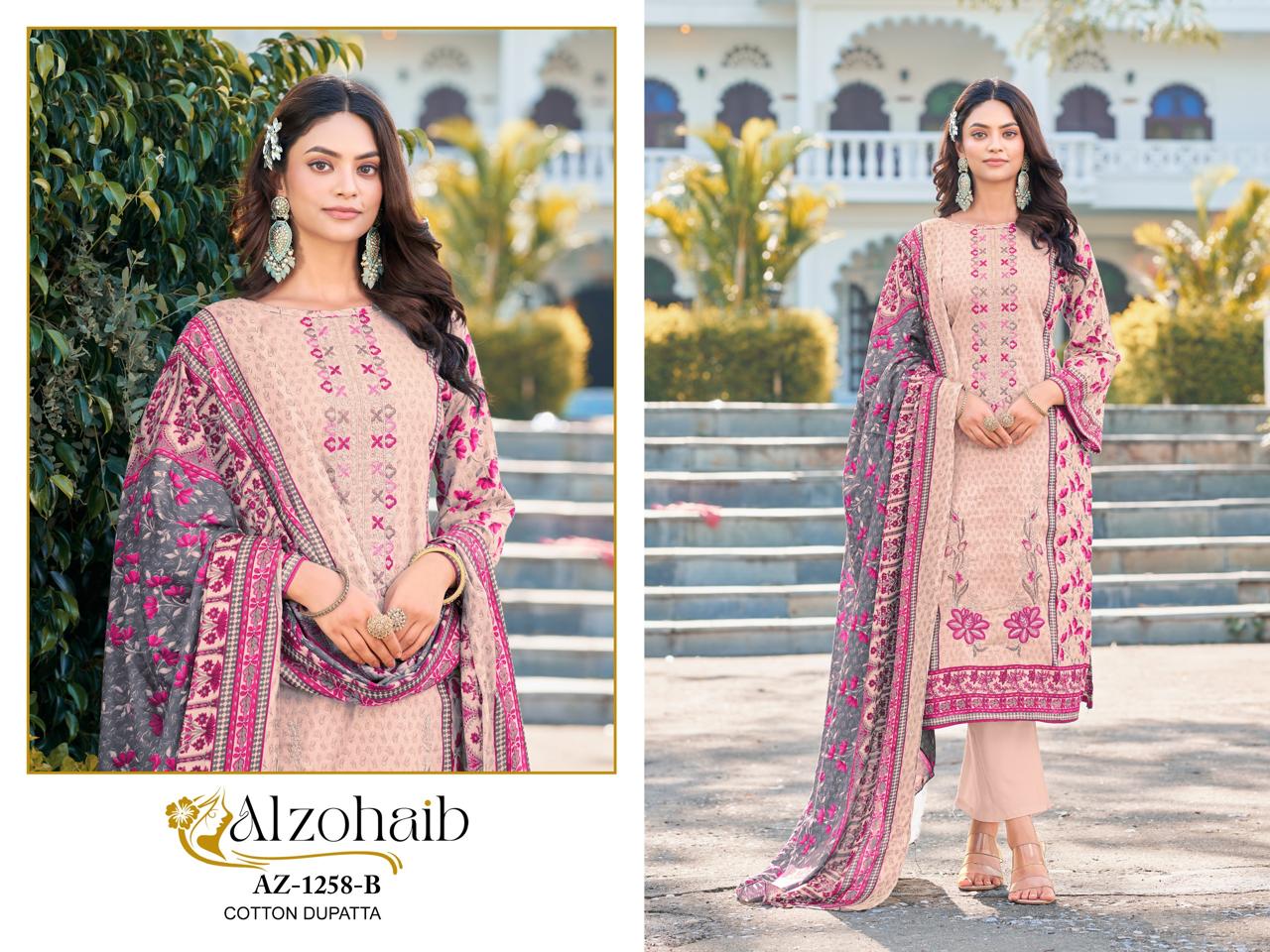 ALZOHAIB D.NO 1258 suitable for both variety of styles and age groups. Can be made in different styles like Anarkali’s, sleek straight-cut suits, and classic salwar sets for every occasion. Whether you want it during your bride-to-be, a busy professional, or someone who loves ethnic wear, this designer suit makes you centre of extraction to everyone.