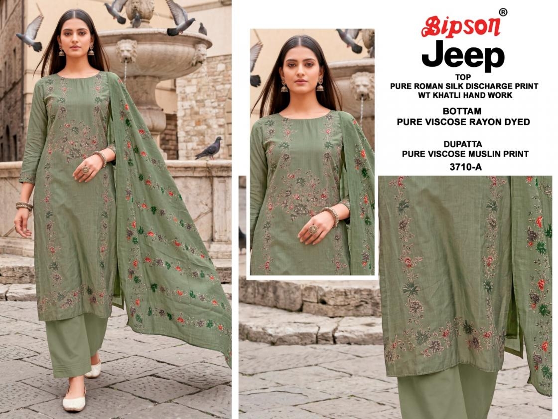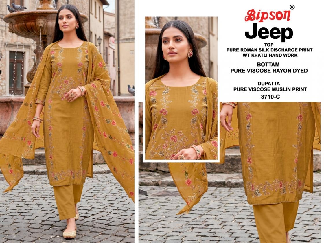 bipson prints jeep wranglar 3710 roman silk dress materials contains superior Fabrics, with perfect craftsmanship makes it one most best quality suits catalogue. Best commitment to ungearing quality.
