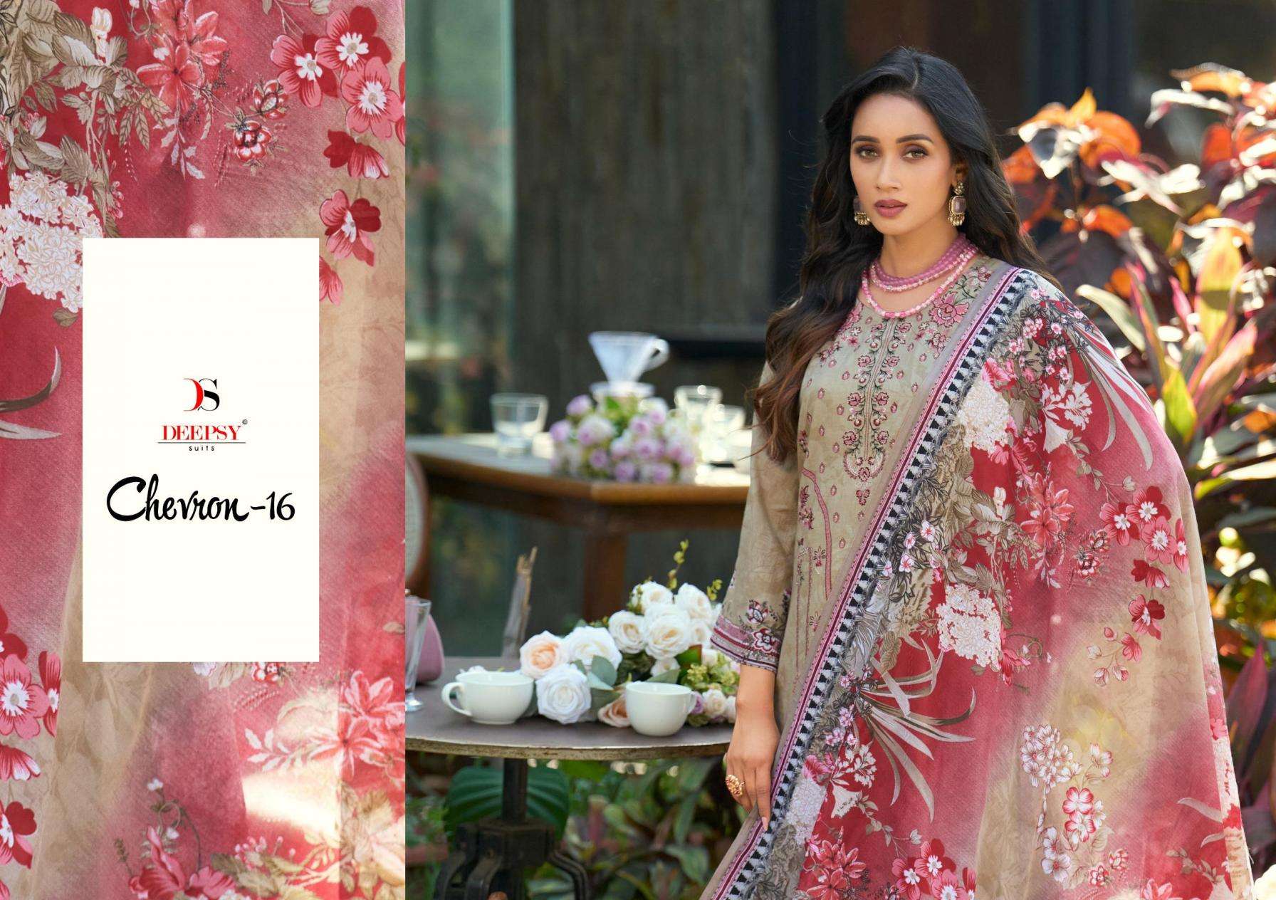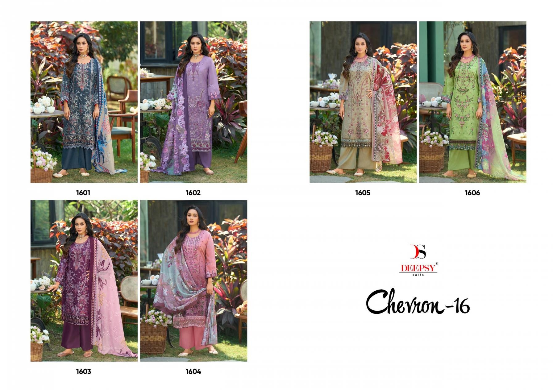 deepsy suits chevron vol 16 series 1601-1606 cotton wholesale suit suitable for both variety of styles and age groups. Can be made in different styles like Anarkali’s, sleek straight-cut suits, and classic salwar sets for every occasion. Whether you want it during your bride-to-be, a busy professional, or someone who loves ethnic wear, this designer suit makes you centre of extraction to everyone.