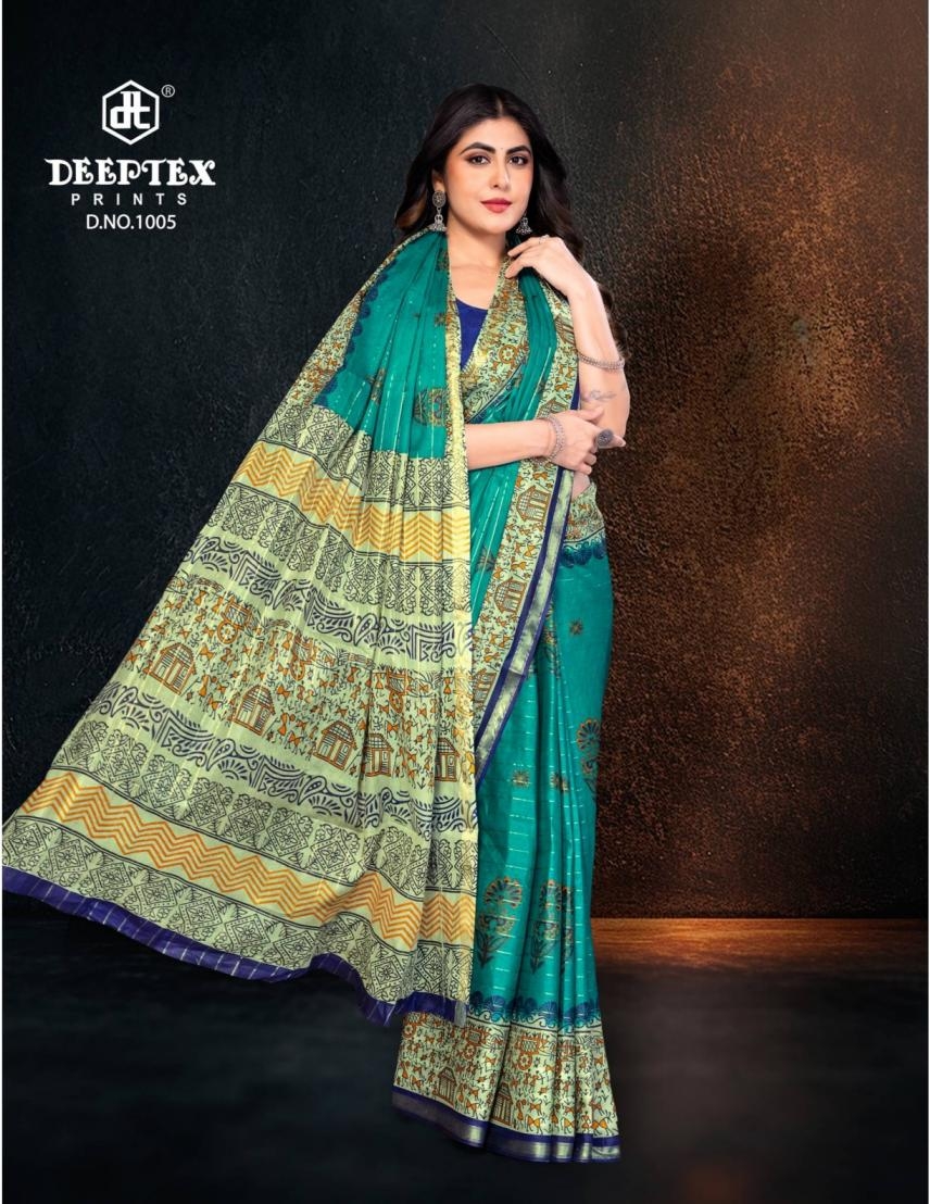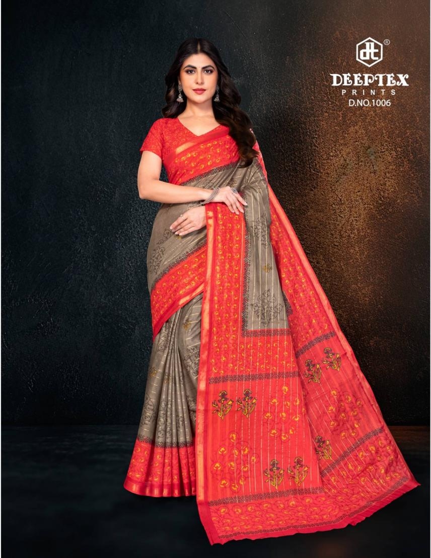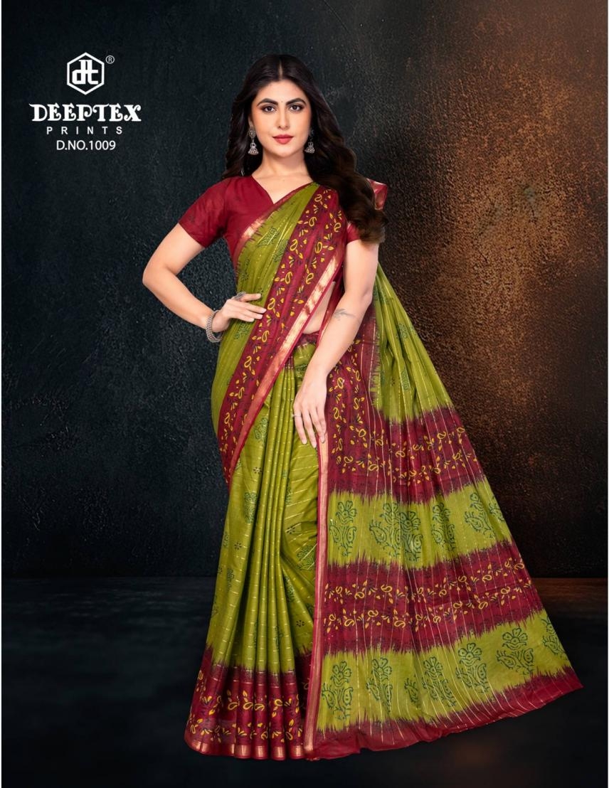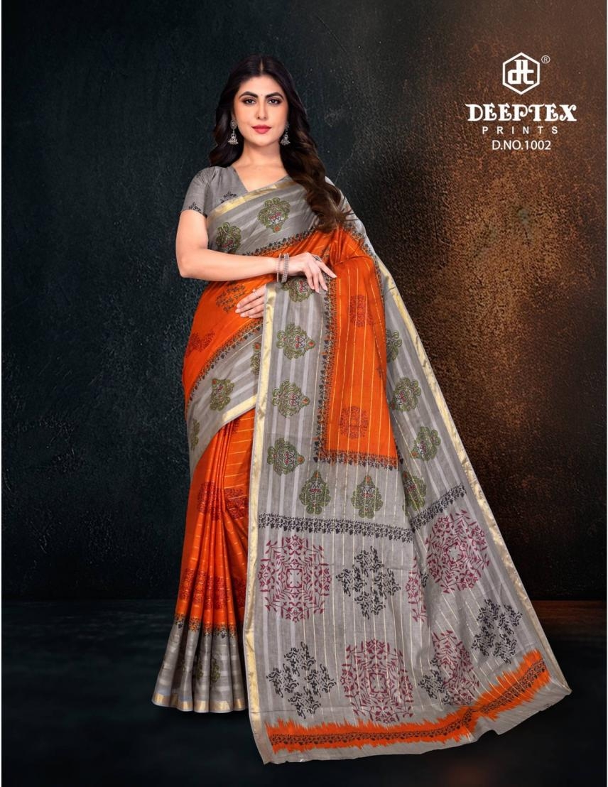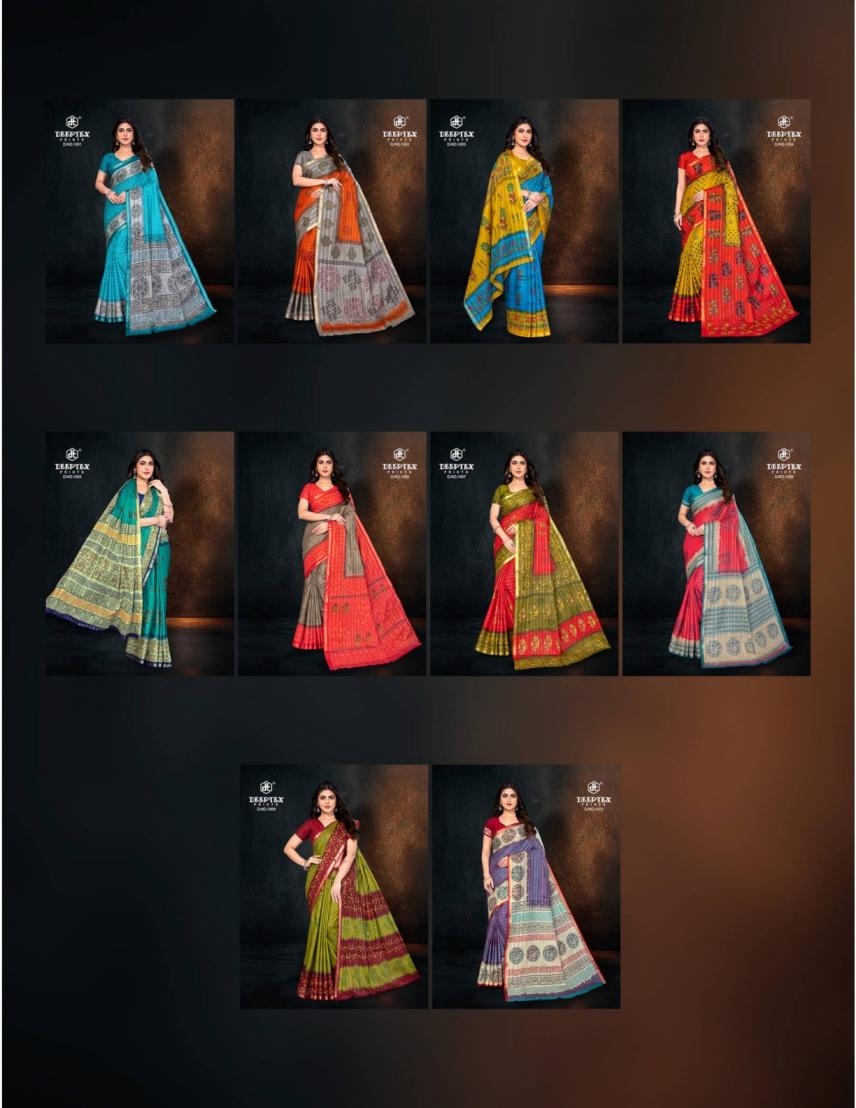 Collection Trend Highlights The deeptex prints block beauty vol 1 series 1001-1010 cotton wholesale saree collection keeps the classic charm of its predecessors while continuously introducing new pieces to stay aligned with the latest trends.