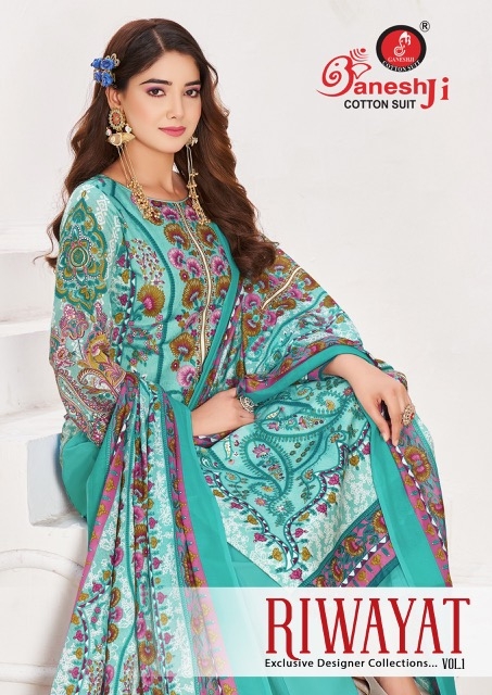 Ganeshji Riwayat Vol-1 series 1001-1008 Heavy Soft Cotton wholesale suit contains superior Fabrics, with perfect craftsmanship makes it one most best quality suits catalogue. Best commitment to ungearing quality.