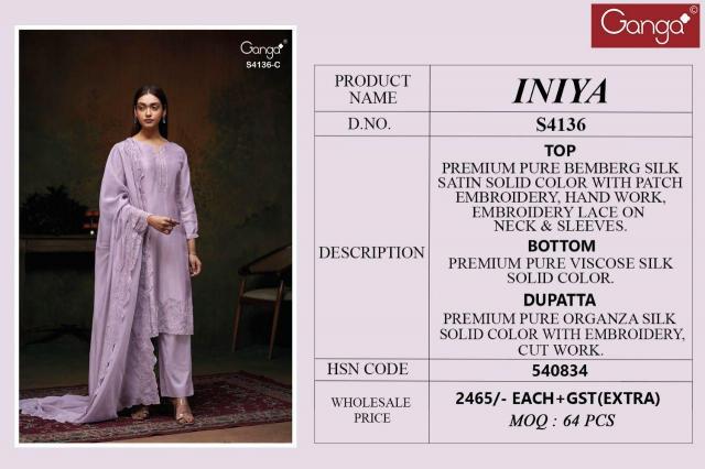 Ganga Iniya 4136 catalog unstitched salwar kameez wholesale market in delhi suits suitable for gifts for birthdays, anniversaries, or weddings, thanks to their beautiful elegant presentation and timeless unique style.