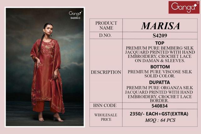 Finally, Fashion is not just clothing but it is much more than that. It is a way to express your identity. With Ganga Marisa 4209 catalog wholesale indian salwar kameez, you are not just wearing a suit, but you will feel more confidence, heritage, and a rich story of craftsmanship that has been going through out generations.