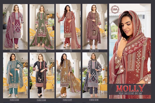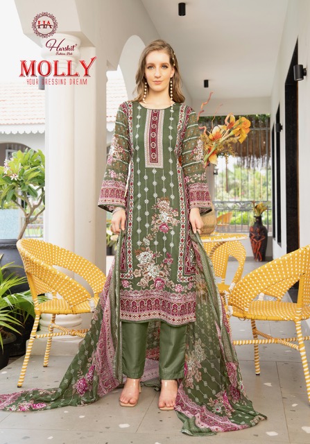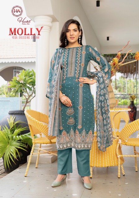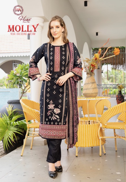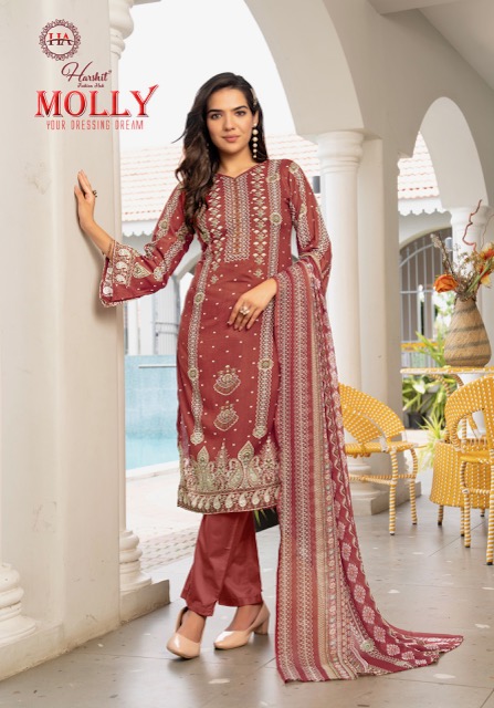HARSHIT FASHION MOLLY contains superior Fabrics, with perfect craftsmanship makes it one most best quality suits catalogue. Best commitment to ungearing quality.