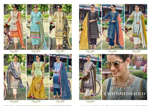 ISHAAL PRINTS EMBROIDERED VOL 16 contains superior Fabrics, with perfect craftsmanship makes it one most best quality suits catalogue. Best commitment to ungearing quality.