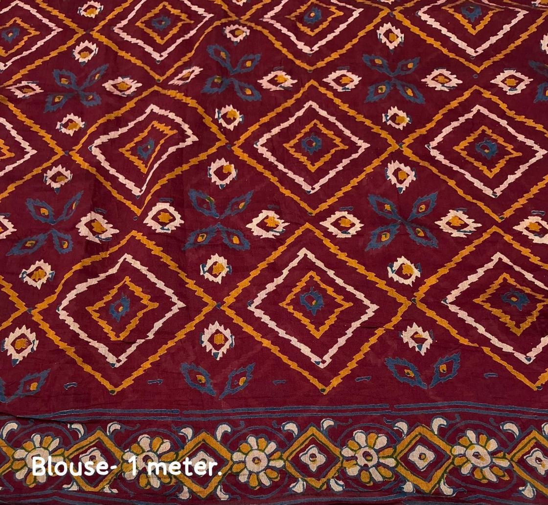 Contrast ajrakh block prints blouse on pure chanderi cotton.