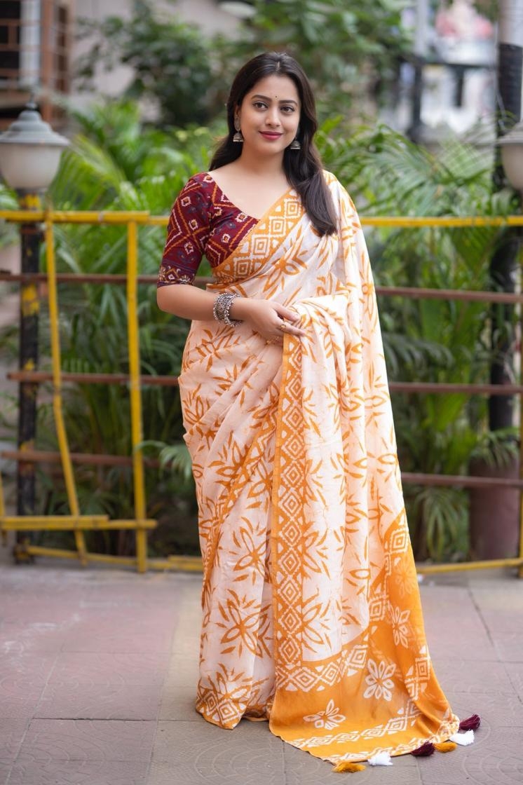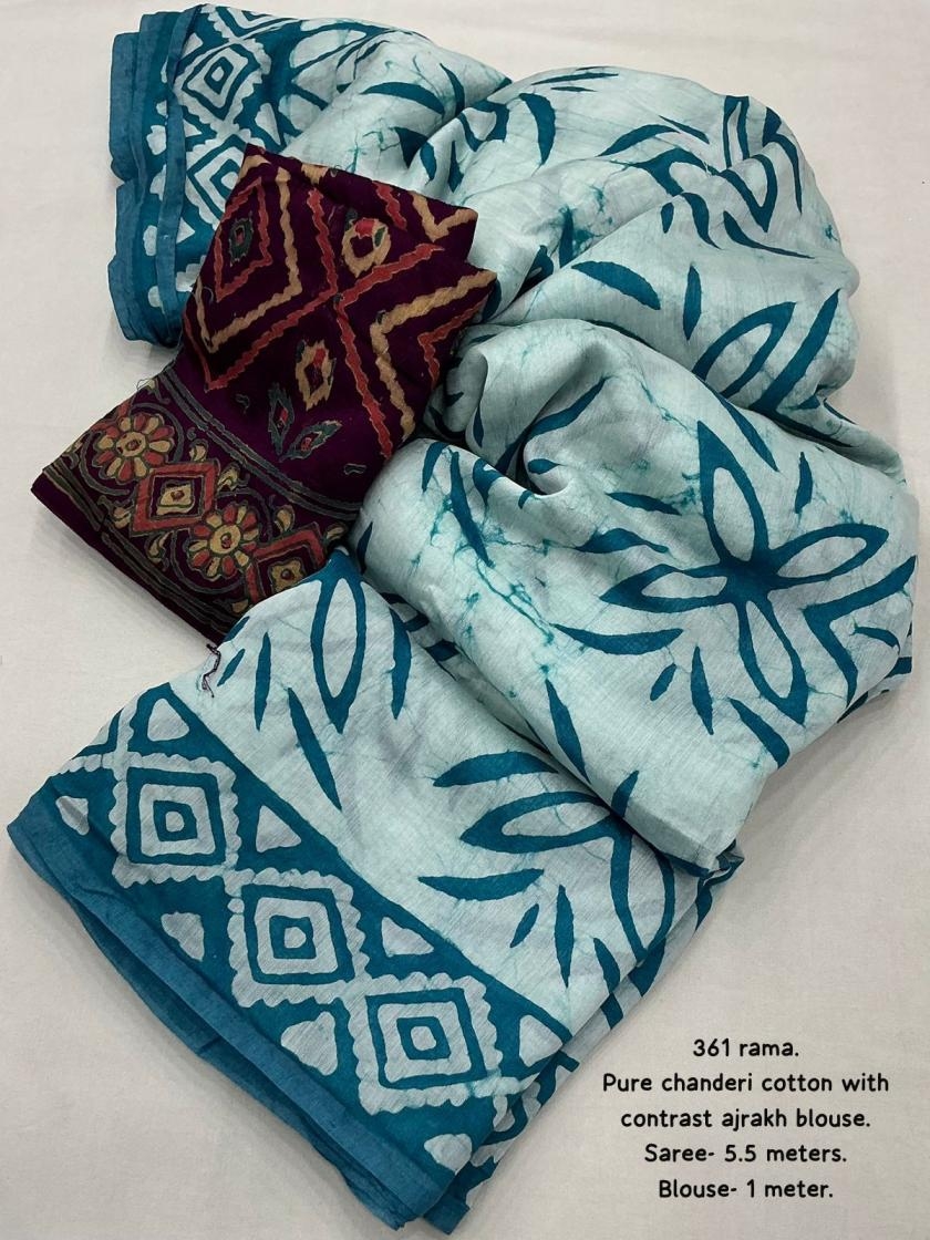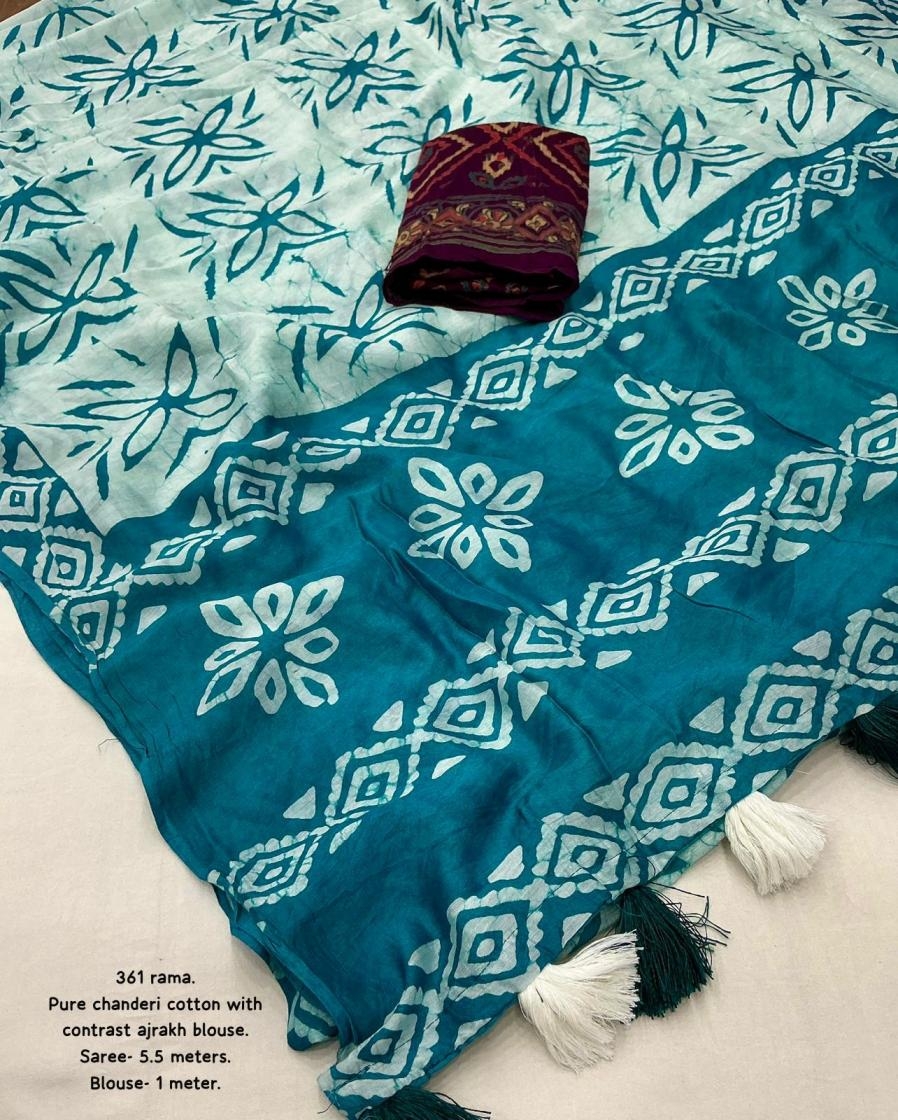 When it comes to traditional wear, quality truly plays and important role. Style never goes out of fashion. kc 361 chanderi cotton new design batik printed sarees brings you a beautiful shade of style, design, and luxury that women have been loved for a long time.