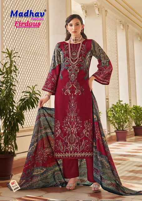 MADHAV FASHION FIRDOUS VOL 4 contains superior Fabrics, with perfect craftsmanship makes it one most best quality suits catalogue. Best commitment to ungearing quality.