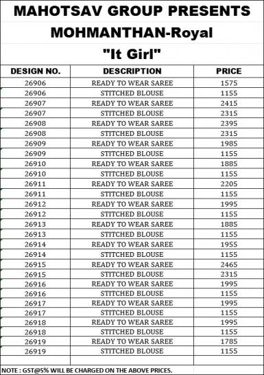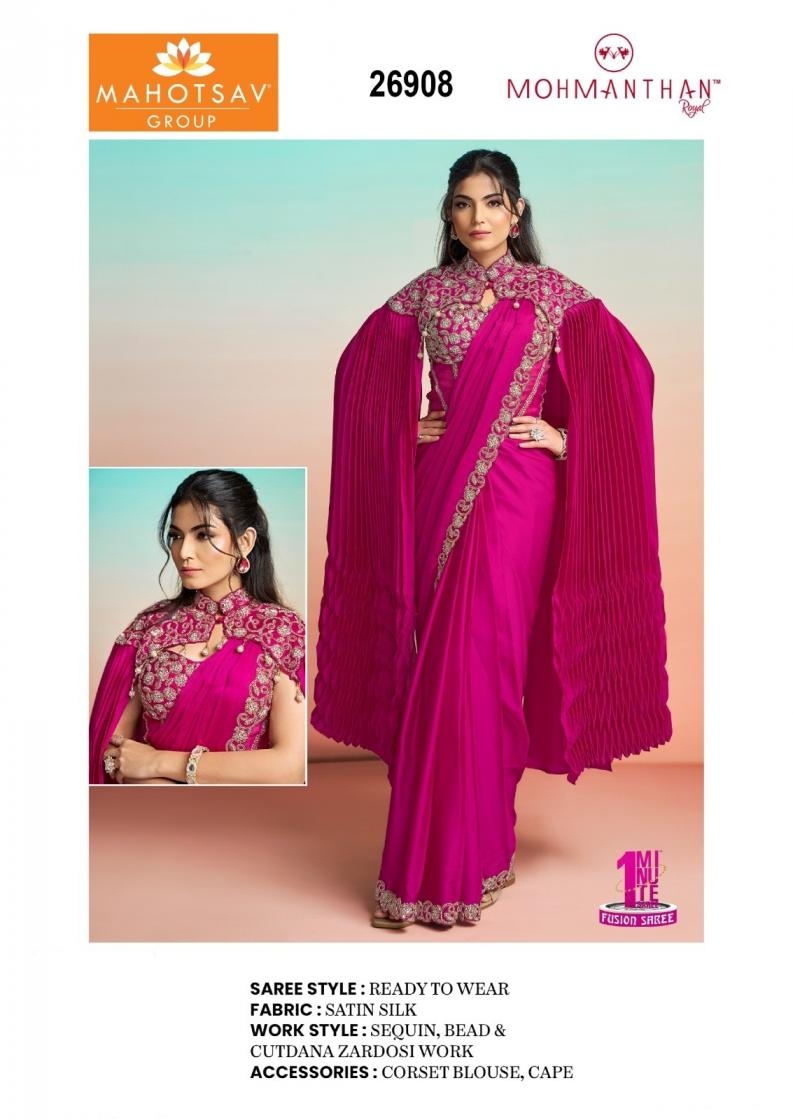 mahotsav it girl 26900 series 26906-26919 satin silk ready to wear saree suitable for both variety of styles and age groups. Can be made in different styles like Anarkali’s, sleek straight-cut suits, and classic salwar sets for every occasion. Whether you want it during your bride-to-be, a busy professional, or someone who loves ethnic wear, this designer suit makes you centre of extraction to everyone.