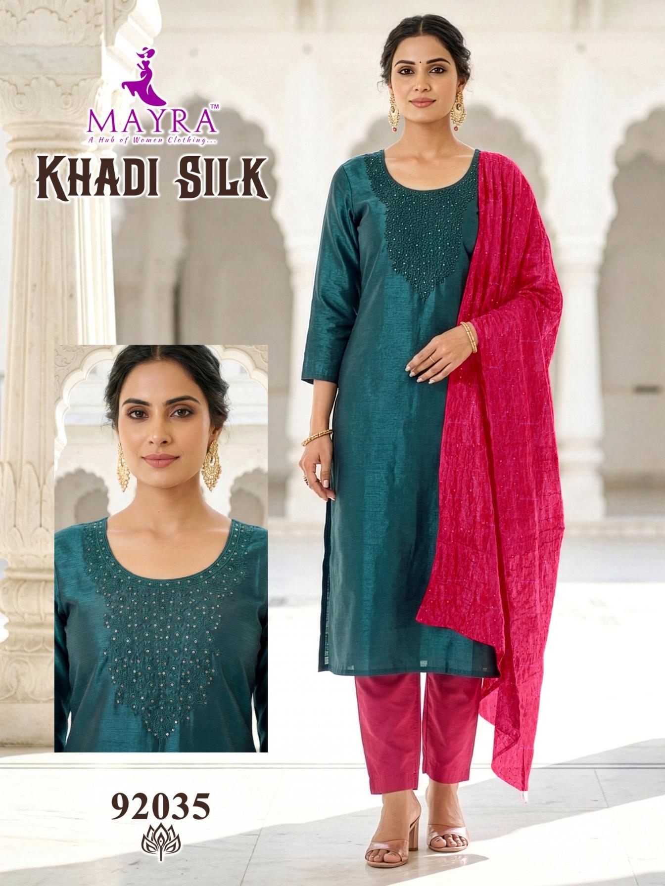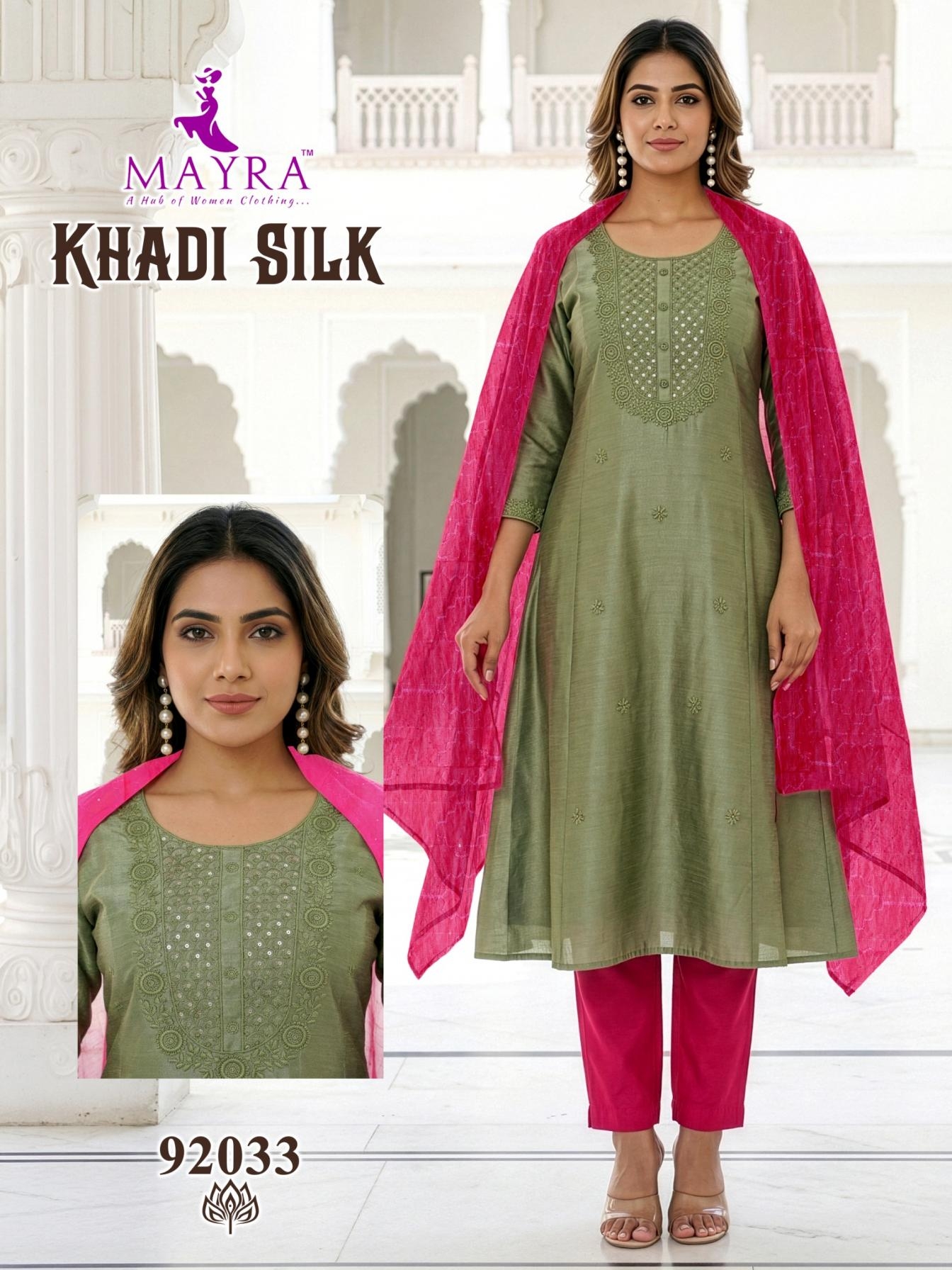 mayra fashion khadi silk series 92033 to 92040 full stitch cotton suit in wholesale surat suitable for both variety of styles and age groups. Can be made in different styles like Anarkali’s, sleek straight-cut suits, and classic salwar sets for every occasion. Whether you want it during your bride-to-be, a busy professional, or someone who loves ethnic wear, this designer suit makes you centre of extraction to everyone.