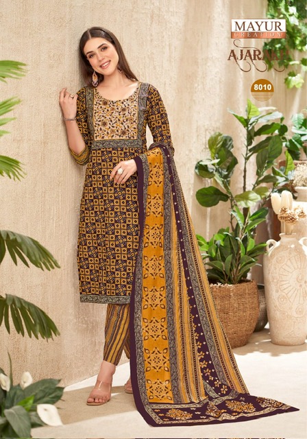MAYUR CREATION AJARAKH VOL 8 contains superior Fabrics, with perfect craftsmanship makes it one most best quality suits catalogue. Best commitment to ungearing quality.