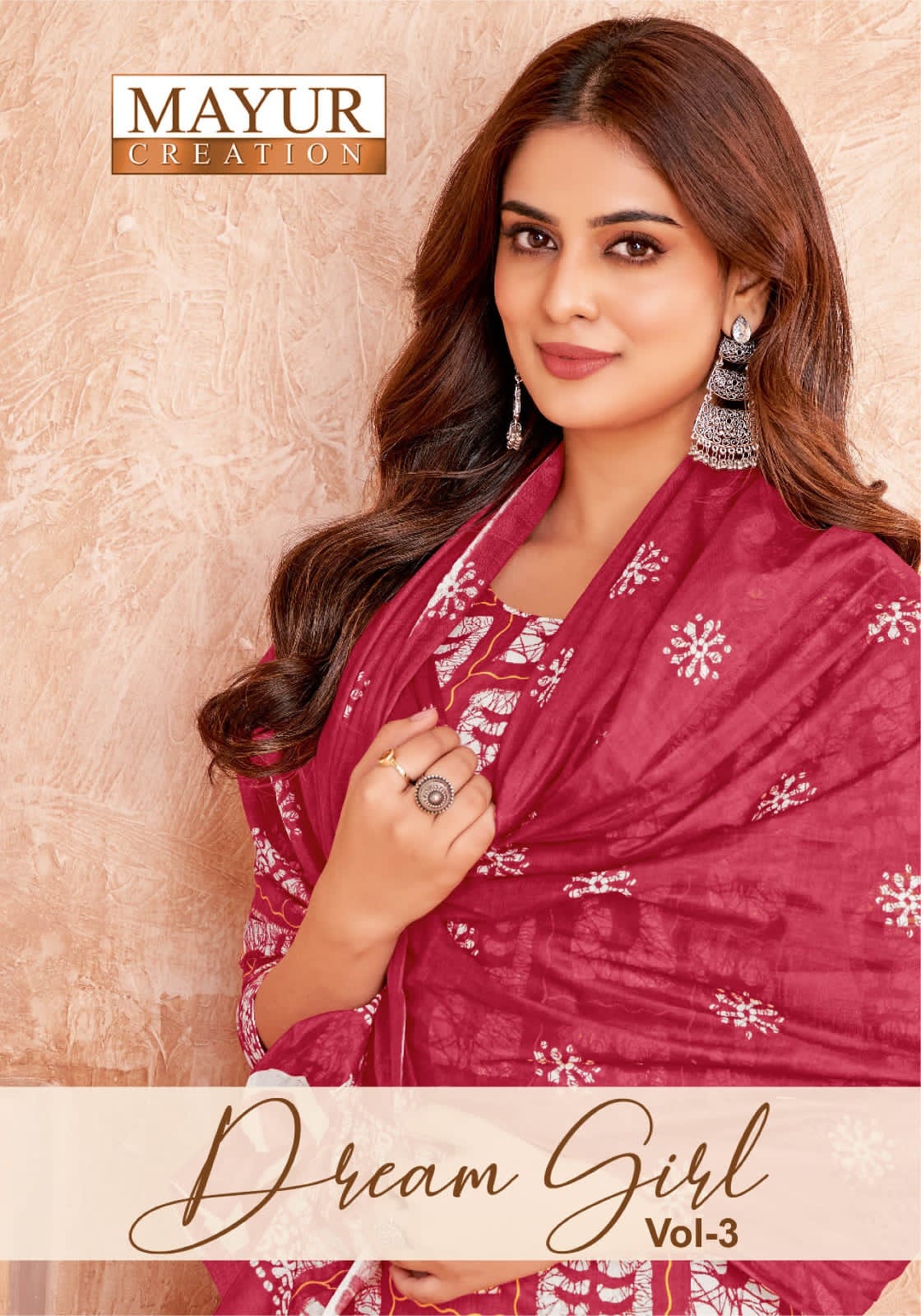 MAYUR DREAM GIRL VOL 3 contains superior Fabrics, with perfect craftsmanship makes it one most best quality suits catalogue. Best commitment to ungearing quality.