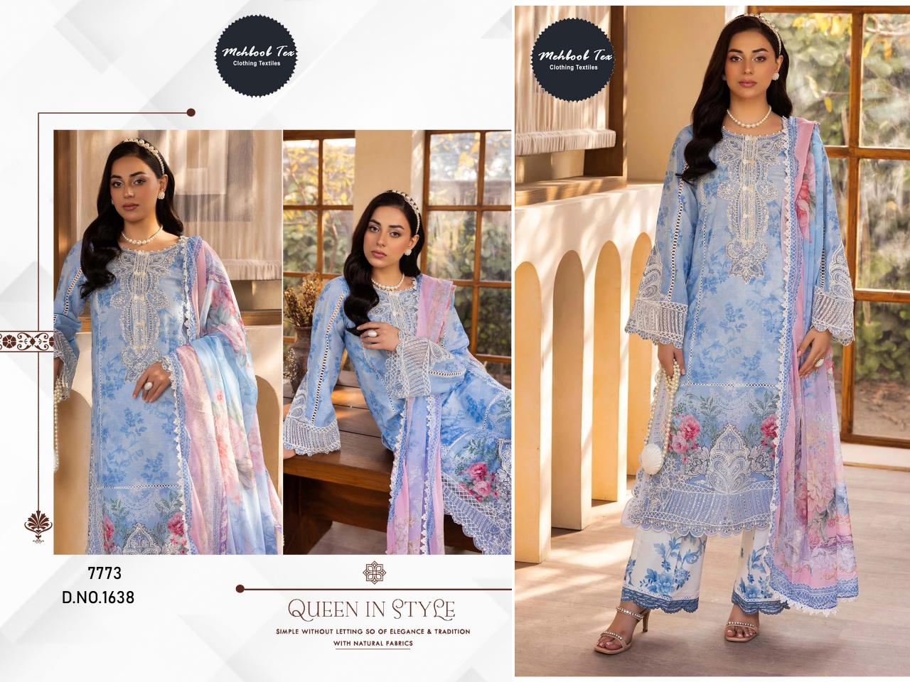 Mehboob Tex 1638 catalog original pakistani suits in surat suitable for both variety of styles and age groups. Can be made in different styles like Anarkali’s, sleek straight-cut suits, and classic salwar sets for every occasion. Whether you want it during your bride-to-be, a busy professional, or someone who loves ethnic wear, this designer suit makes you centre of extraction to everyone.