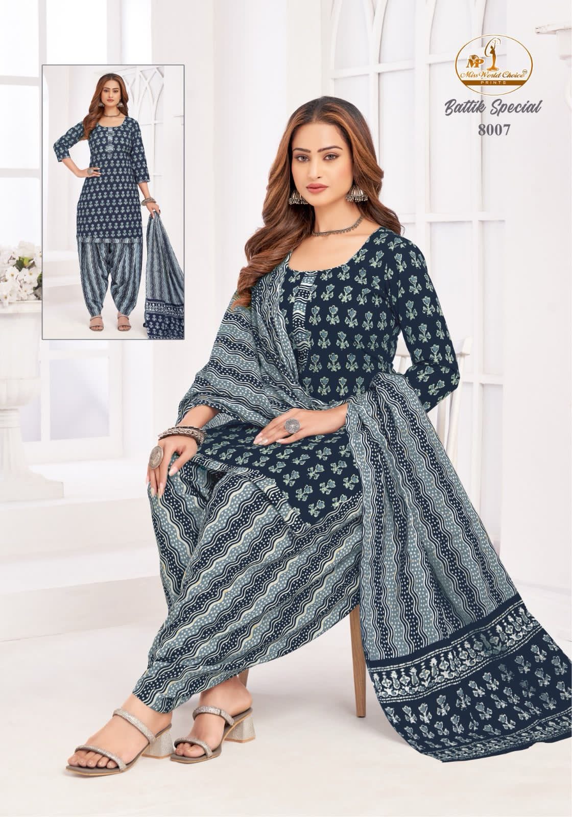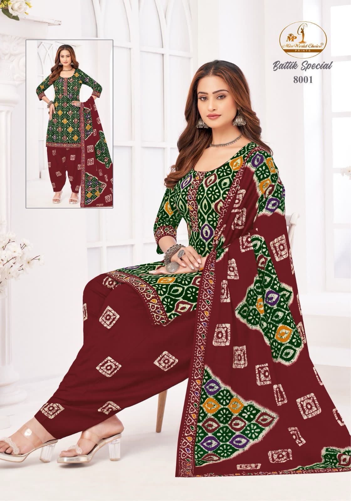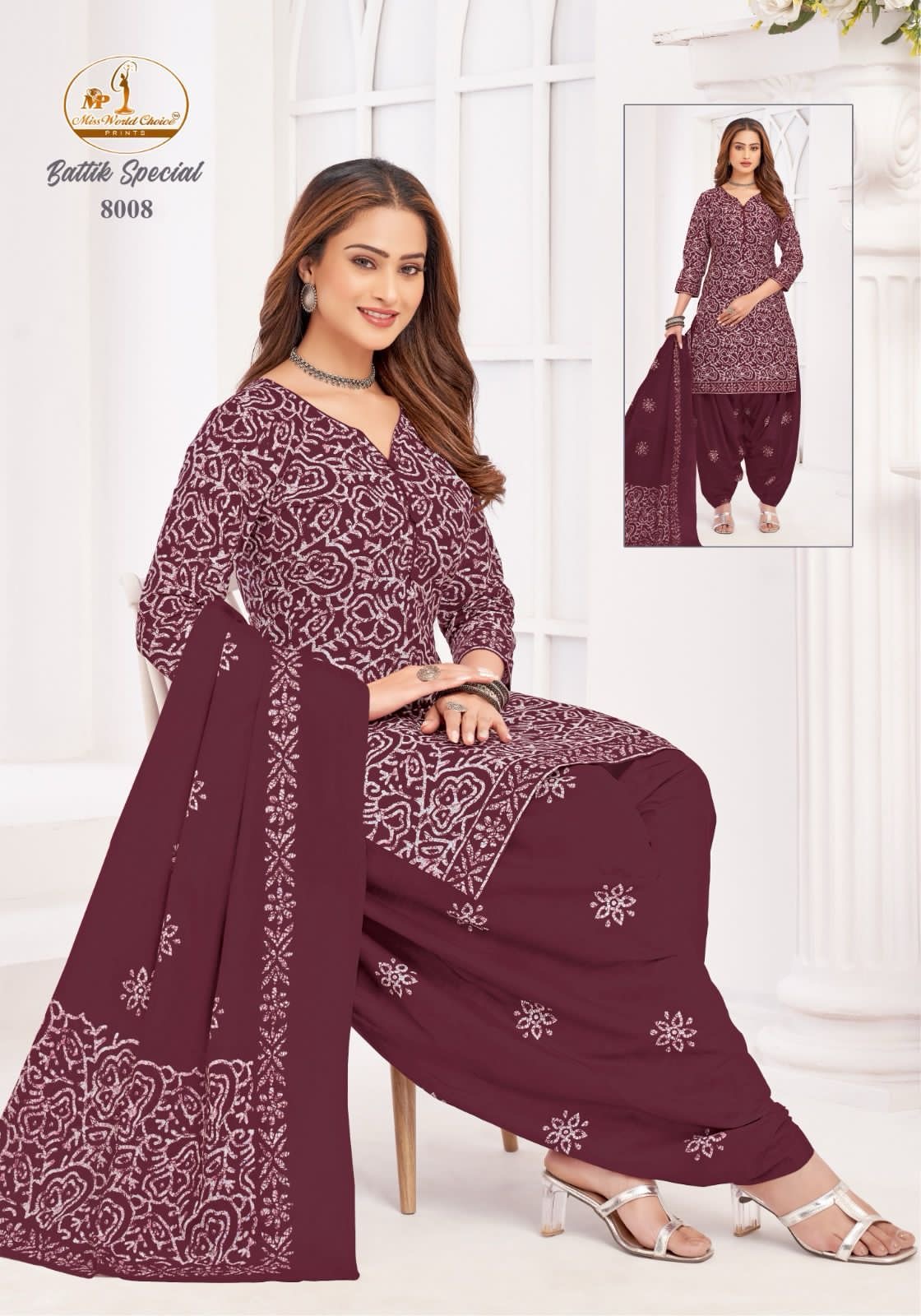 MISS WORLD BATTIK SPECIAL VOL 8 contains superior Fabrics, with perfect craftsmanship makes it one most best quality suits catalogue. Best commitment to ungearing quality.