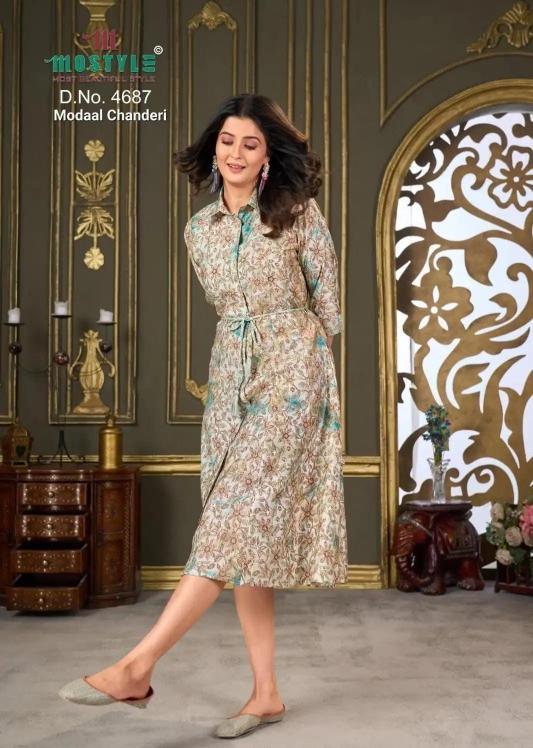 Mostyle 4687 catalog knee lenth long western wear suitable for both variety of styles and age groups. Can be made in different styles like Anarkali’s, sleek straight-cut suits, and classic salwar sets for every occasion. Whether you want it during your bride-to-be, a busy professional, or someone who loves ethnic wear, this designer suit makes you centre of extraction to everyone.