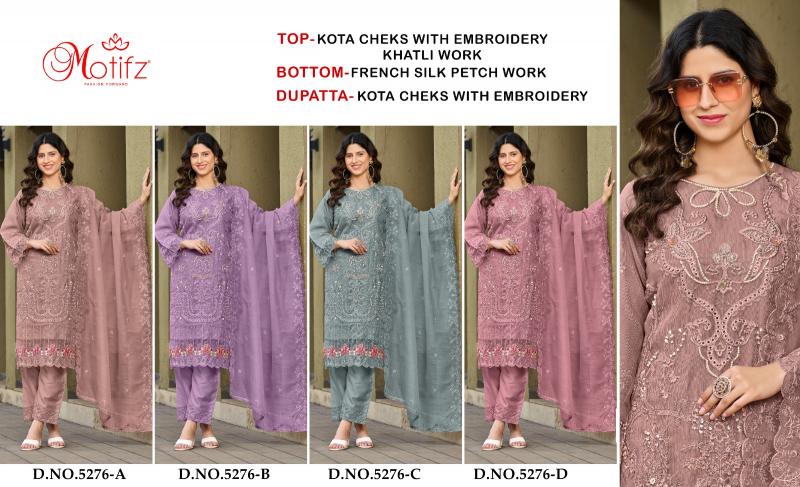 Motifz 5276 catalog pakistani suits in wholesale price contains superior Fabrics, with perfect craftsmanship makes it one most best quality suits catalogue. Best commitment to ungearing quality.