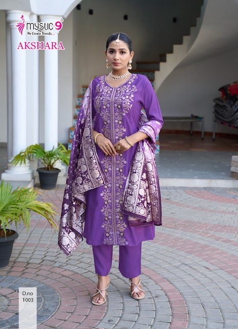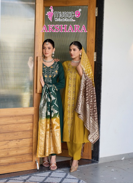 MYSTIC 9 AKSHARA VOL 1 contains superior Fabrics, with perfect craftsmanship makes it one most best quality suits catalogue. Best commitment to ungearing quality.