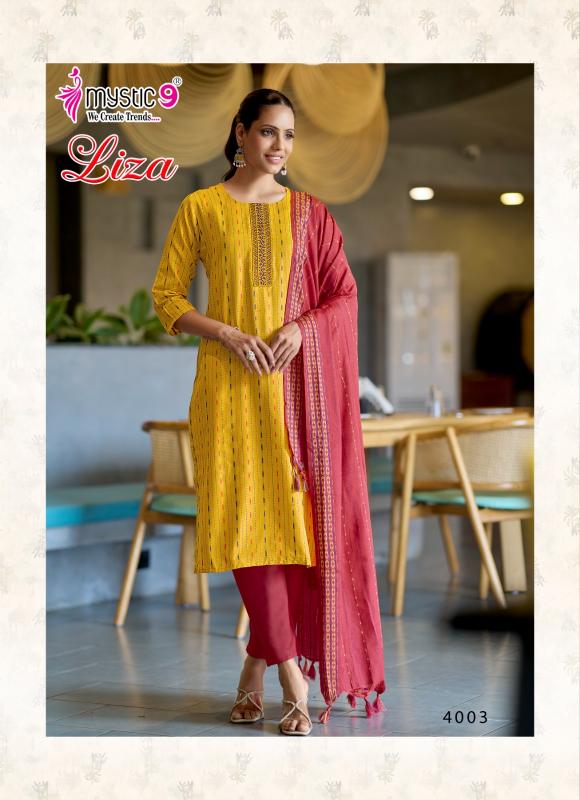 Mystic 9 Liza Vol 4 catalog wholesale kurtis catalog contains superior Fabrics, with perfect craftsmanship makes it one most best quality suits catalogue. Best commitment to ungearing quality.