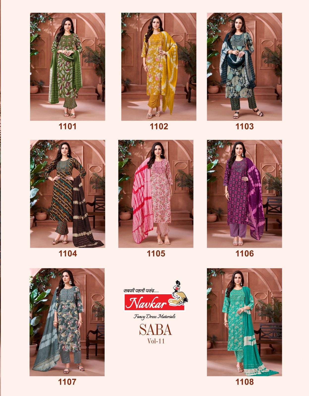 Collection Trend Highlights The NAVKAR SABA VOL 11 collection keeps the classic charm of its predecessors while continuously introducing new pieces to stay aligned with the latest trends.