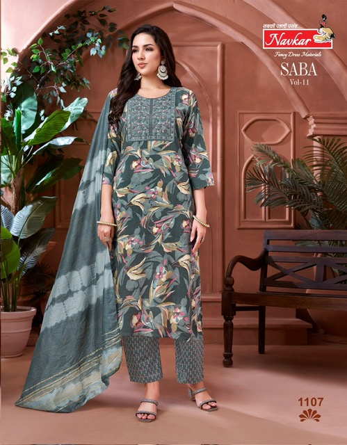 NAVKAR SABA VOL 11 contains superior Fabrics, with perfect craftsmanship makes it one most best quality suits catalogue. Best commitment to ungearing quality.