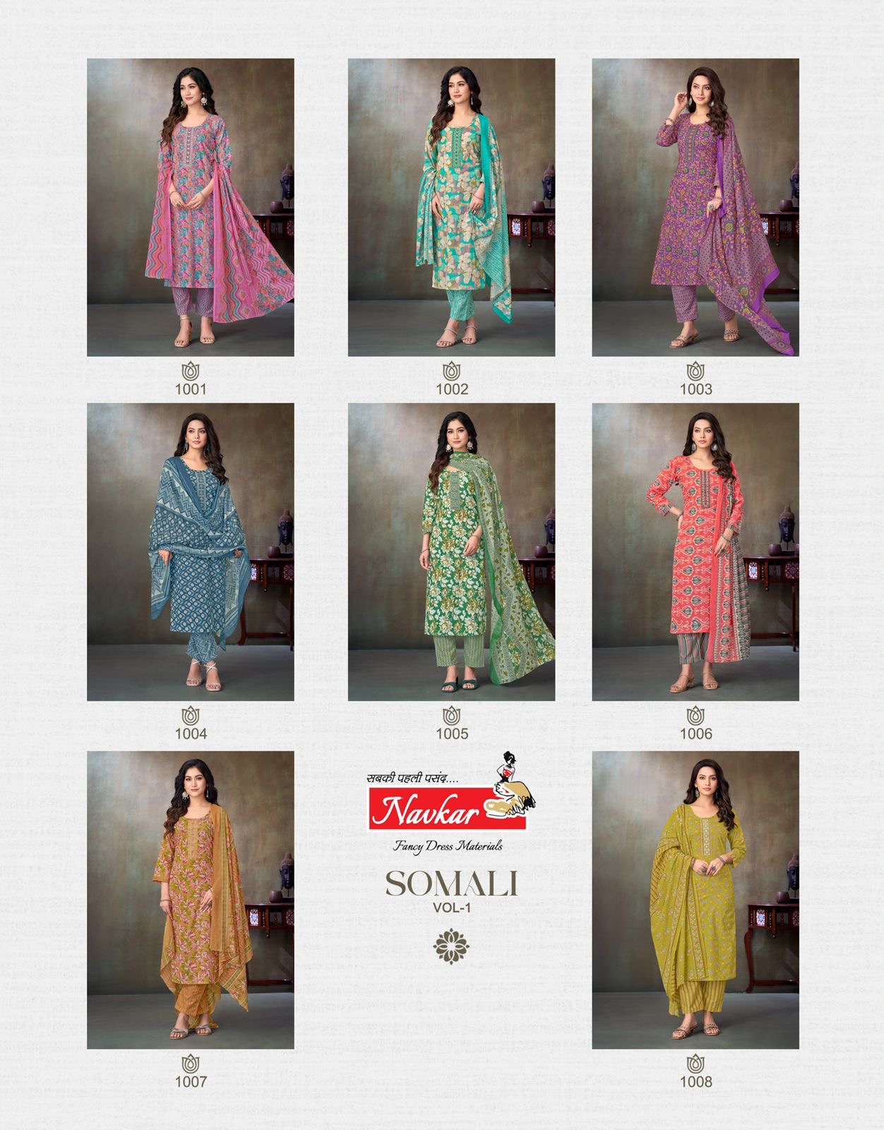 NAVKAR SOMALI VOL 1 contains superior Fabrics, with perfect craftsmanship makes it one most best quality suits catalogue. Best commitment to ungearing quality.