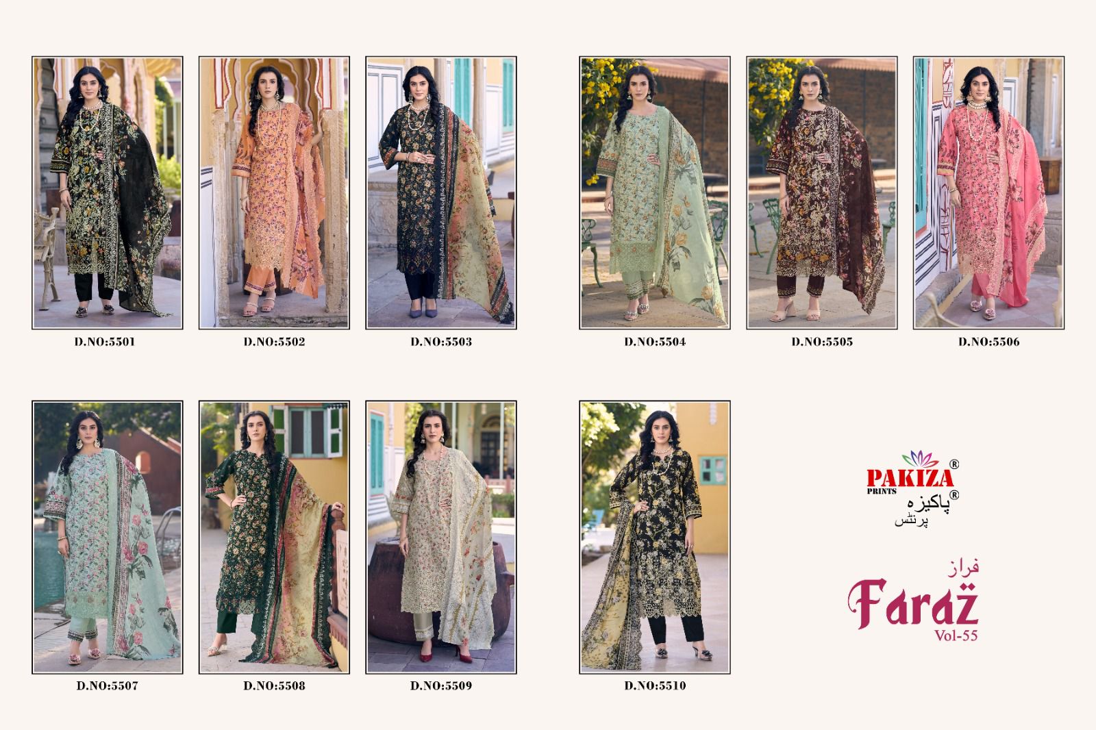 PAKIZA PRINTS FARAZ VOL 55 has a suit design for every event, whether you are going for formal gathering or a casual get-together you can style the collection: