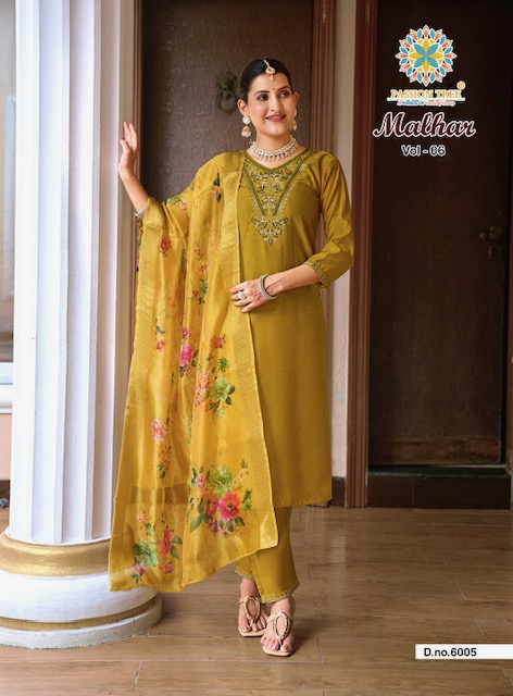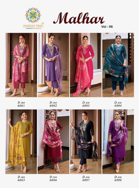 PASSION TREE MALHAR VOL 6 contains superior Fabrics, with perfect craftsmanship makes it one most best quality suits catalogue. Best commitment to ungearing quality.