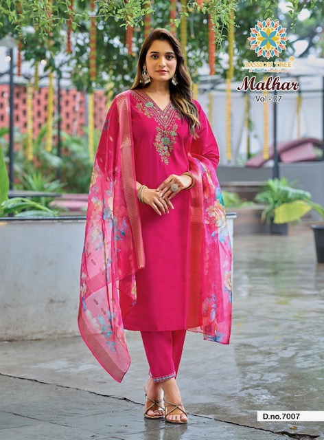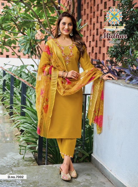 PASSION TREE MALHAR VOL 7 contains superior Fabrics, with perfect craftsmanship makes it one most best quality suits catalogue. Best commitment to ungearing quality.