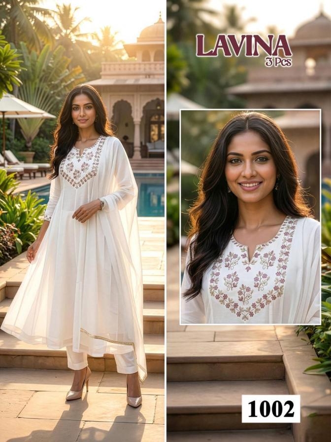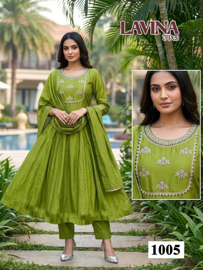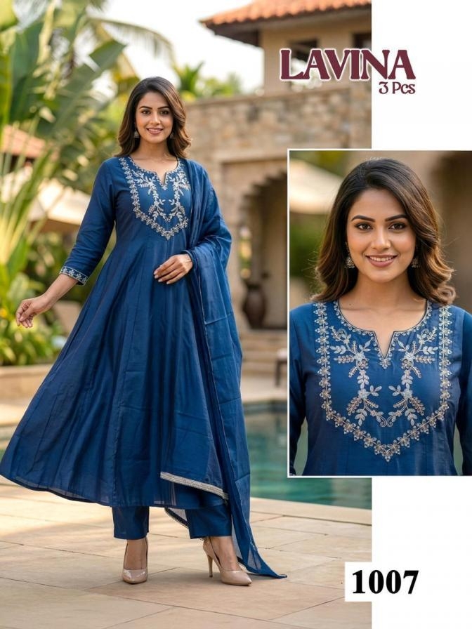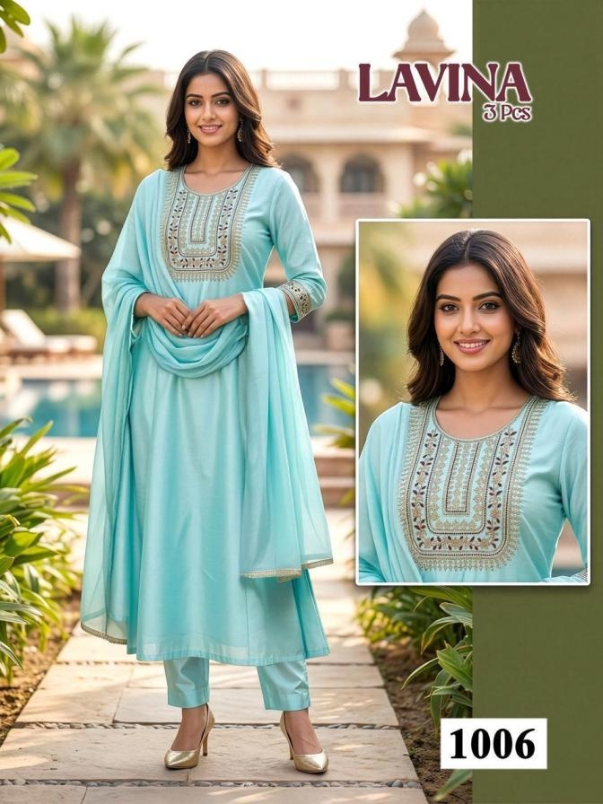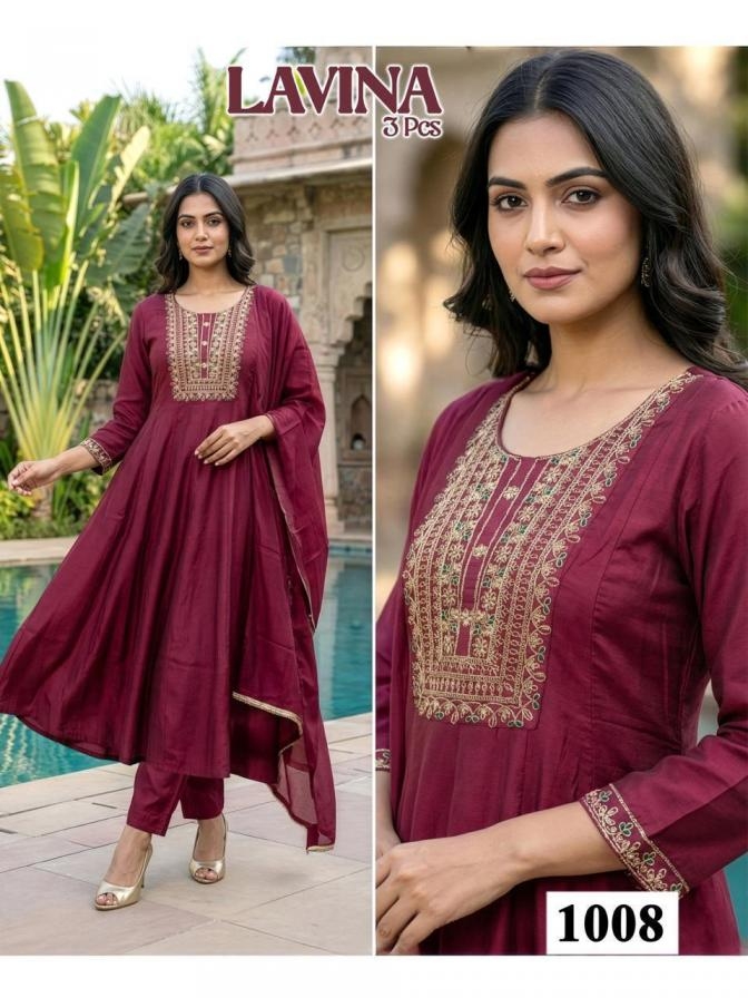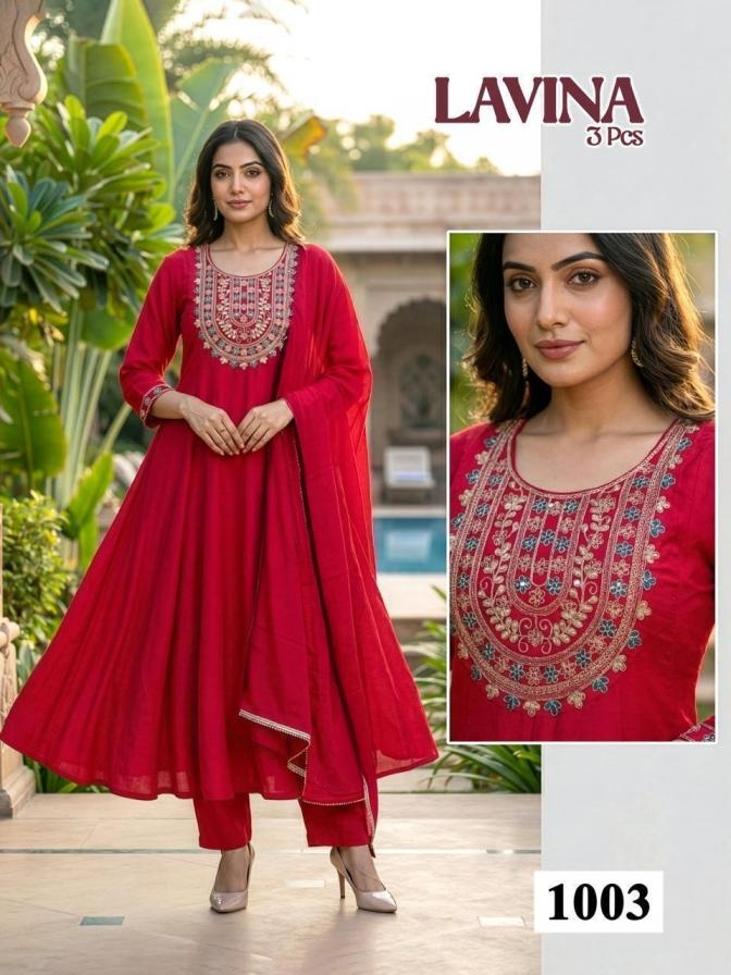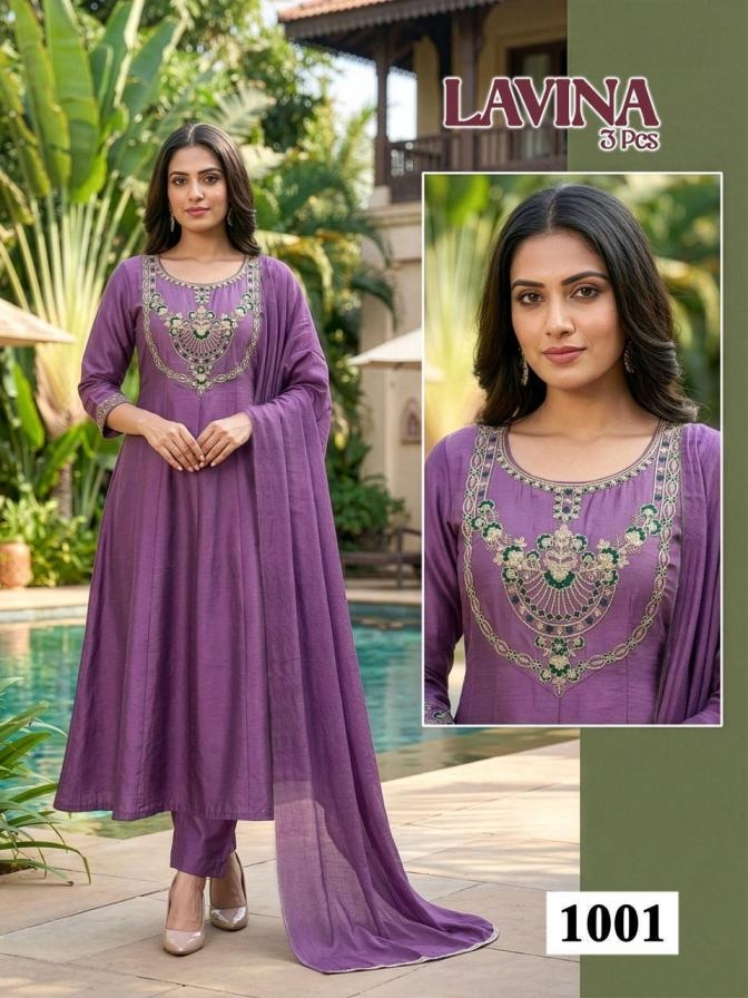 pr lavina series 1001 to 1008 roman silk attractive readymade suit in wholesale surat suitable for both variety of styles and age groups. Can be made in different styles like Anarkali’s, sleek straight-cut suits, and classic salwar sets for every occasion. Whether you want it during your bride-to-be, a busy professional, or someone who loves ethnic wear, this designer suit makes you centre of extraction to everyone.