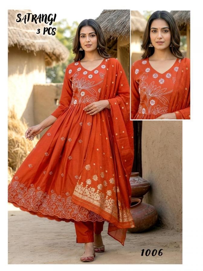 pr satrangi series 1001 to 1008 fancy readymnade summer beauty suit in wholesale surat suitable for both variety of styles and age groups. Can be made in different styles like Anarkali’s, sleek straight-cut suits, and classic salwar sets for every occasion. Whether you want it during your bride-to-be, a busy professional, or someone who loves ethnic wear, this designer suit makes you centre of extraction to everyone.