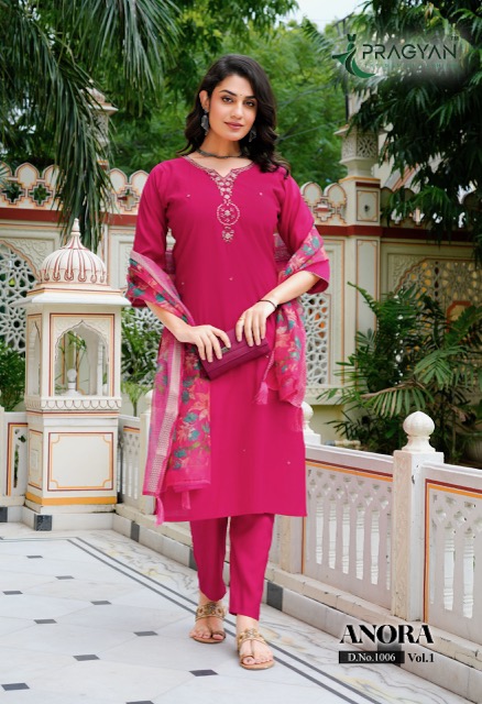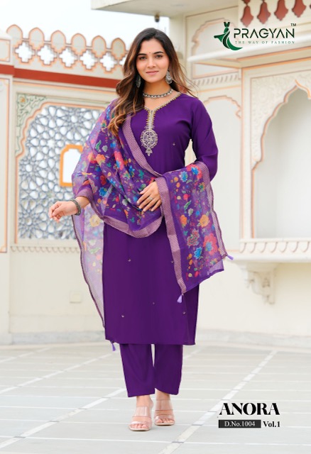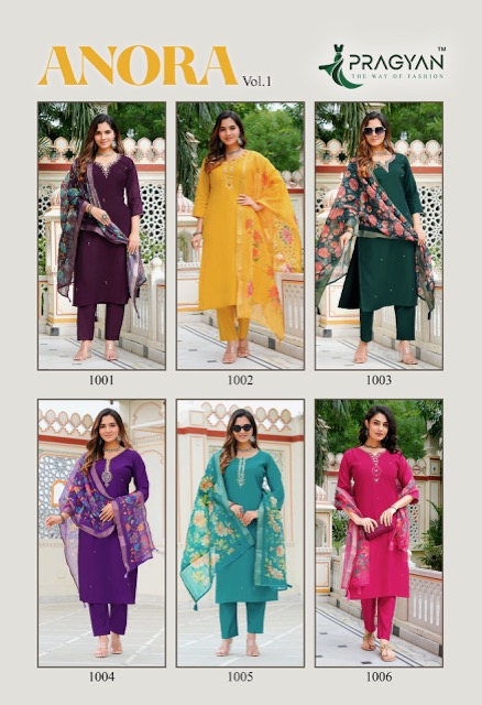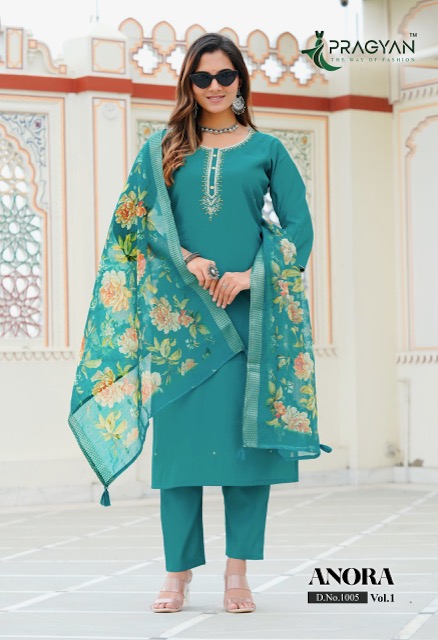 PRAGYAN ANORA VOL 1 contains superior Fabrics, with perfect craftsmanship makes it one most best quality suits catalogue. Best commitment to ungearing quality.