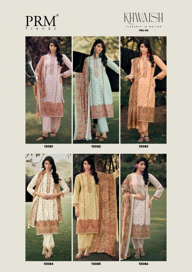 A Designer Collection that speaks about Volumes. prm trendz khwaish vol 2 series 13081-13086 Pure Lawn cotton wholesale suit catalogue is more than just a clothing collection; it speaks the story of fashion, comfort, and culture.