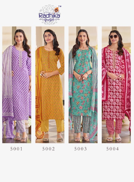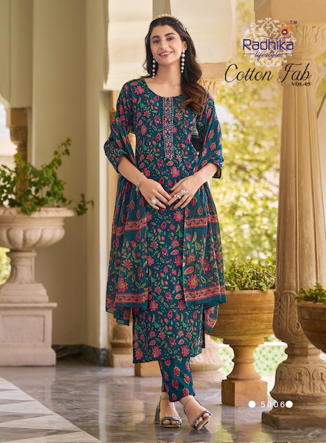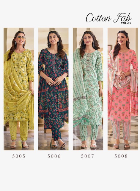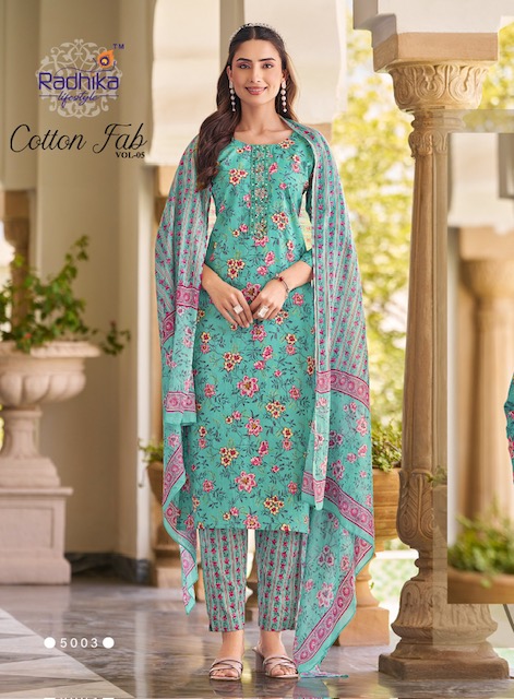 RADHIKA LIFESTYLE COTTON FAB VOL 5 has a suit design for every event, whether you are going for formal gathering or a casual get-together you can style the collection: