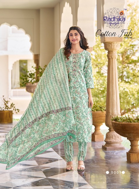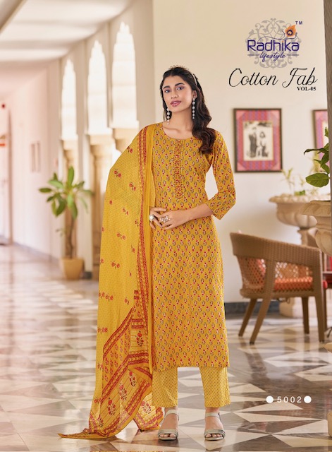 RADHIKA LIFESTYLE COTTON FAB VOL 5 contains superior Fabrics, with perfect craftsmanship makes it one most best quality suits catalogue. Best commitment to ungearing quality.