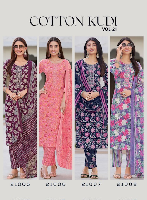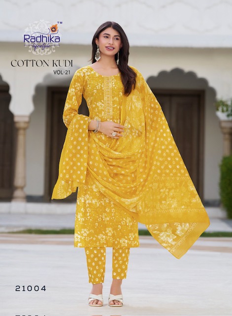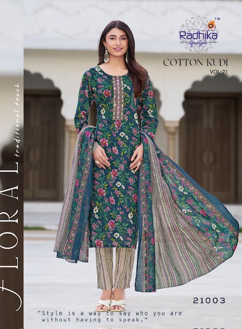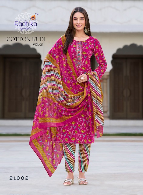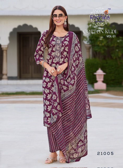 RADHIKA LIFESTYLE COTTON KUDI VOL 21 contains superior Fabrics, with perfect craftsmanship makes it one most best quality suits catalogue. Best commitment to ungearing quality.
