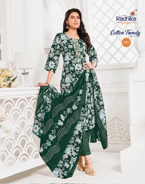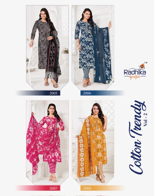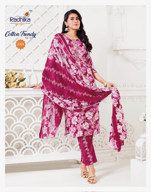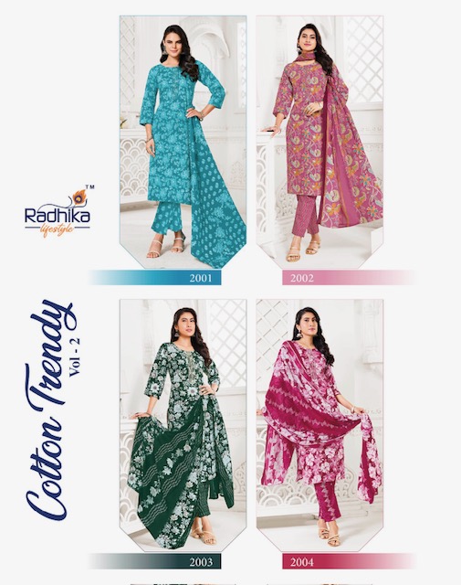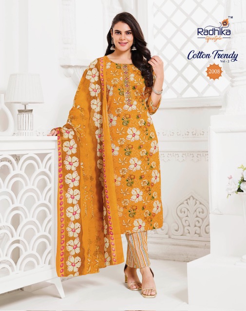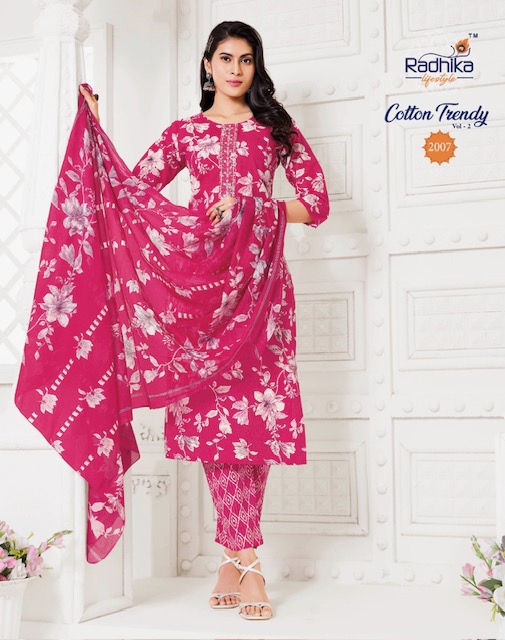 RADHIKA LIFESTYLE COTTON TRENDY VOL 2 contains superior Fabrics, with perfect craftsmanship makes it one most best quality suits catalogue. Best commitment to ungearing quality.