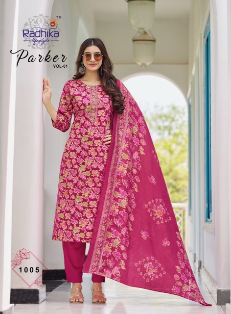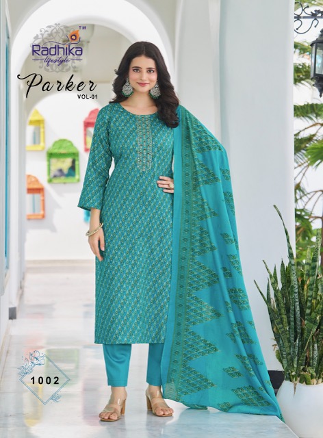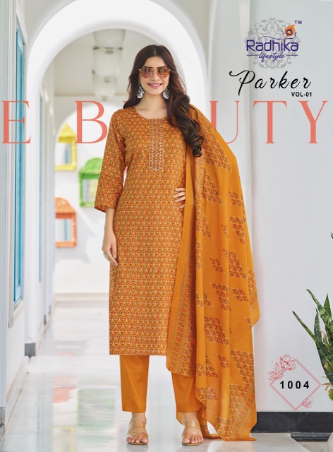 RADHIKA LIFESTYLE PARKER VOL 1 contains superior Fabrics, with perfect craftsmanship makes it one most best quality suits catalogue. Best commitment to ungearing quality.