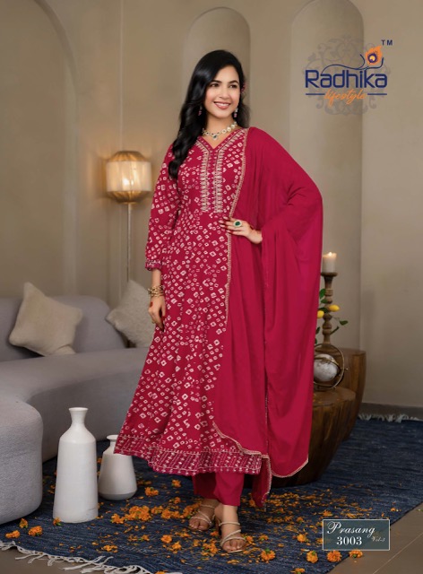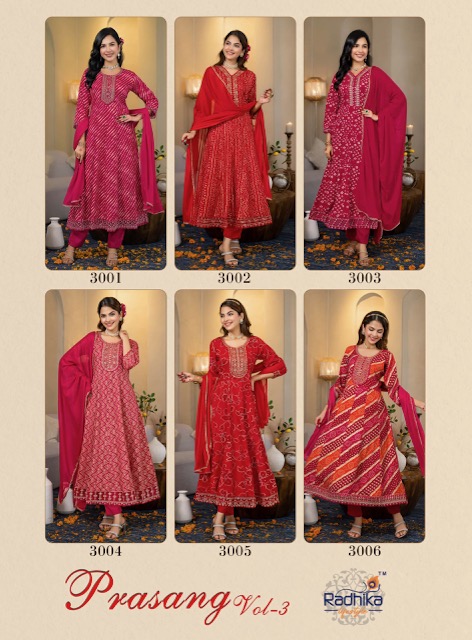 RADHIKA LIFESTYLE PRASANG VOL 3 contains superior Fabrics, with perfect craftsmanship makes it one most best quality suits catalogue. Best commitment to ungearing quality.