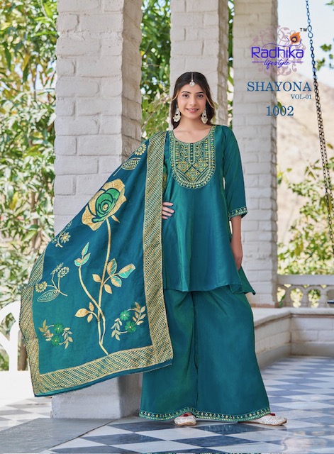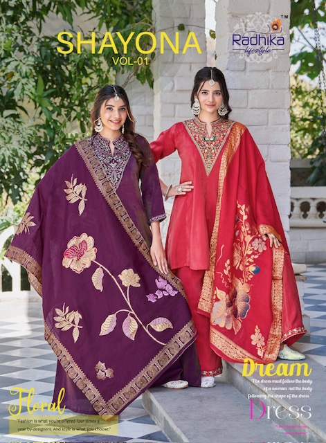 RADHIKA LIFESTYLE SHAYONA VOL 1 contains superior Fabrics, with perfect craftsmanship makes it one most best quality suits catalogue. Best commitment to ungearing quality.