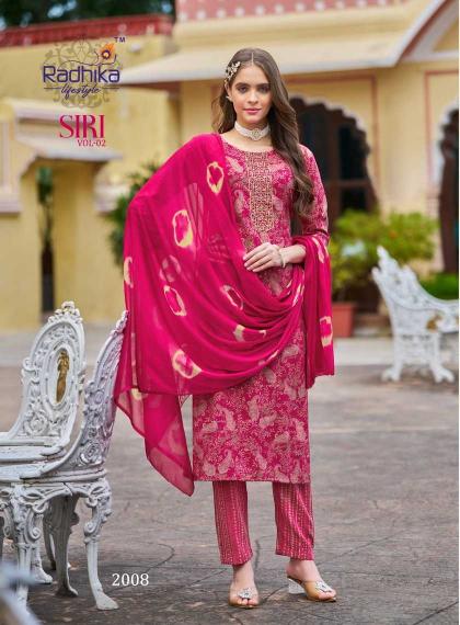 Radhika Lifestyle Siri Vol 2 series 2001-2008 Readymade Rayon Capsule Print Fancy Big Size Dresses suitable for both variety of styles and age groups. Can be made in different styles like Anarkali’s, sleek straight-cut suits, and classic salwar sets for every occasion. Whether you want it during your bride-to-be, a busy professional, or someone who loves ethnic wear, this designer suit makes you centre of extraction to everyone.