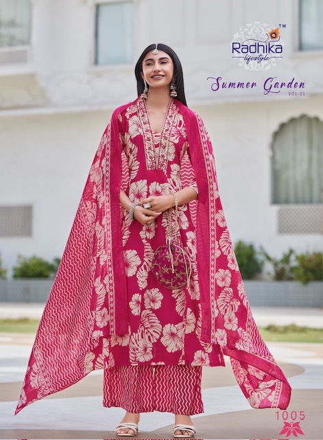 RADHIKA LIFESTYLE SUMMER GARDEN VOL 1 contains superior Fabrics, with perfect craftsmanship makes it one most best quality suits catalogue. Best commitment to ungearing quality.