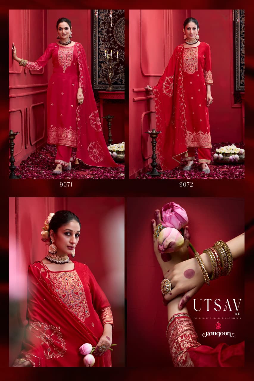 RANGOON UTSAV NX contains superior Fabrics, with perfect craftsmanship makes it one most best quality suits catalogue. Best commitment to ungearing quality.
