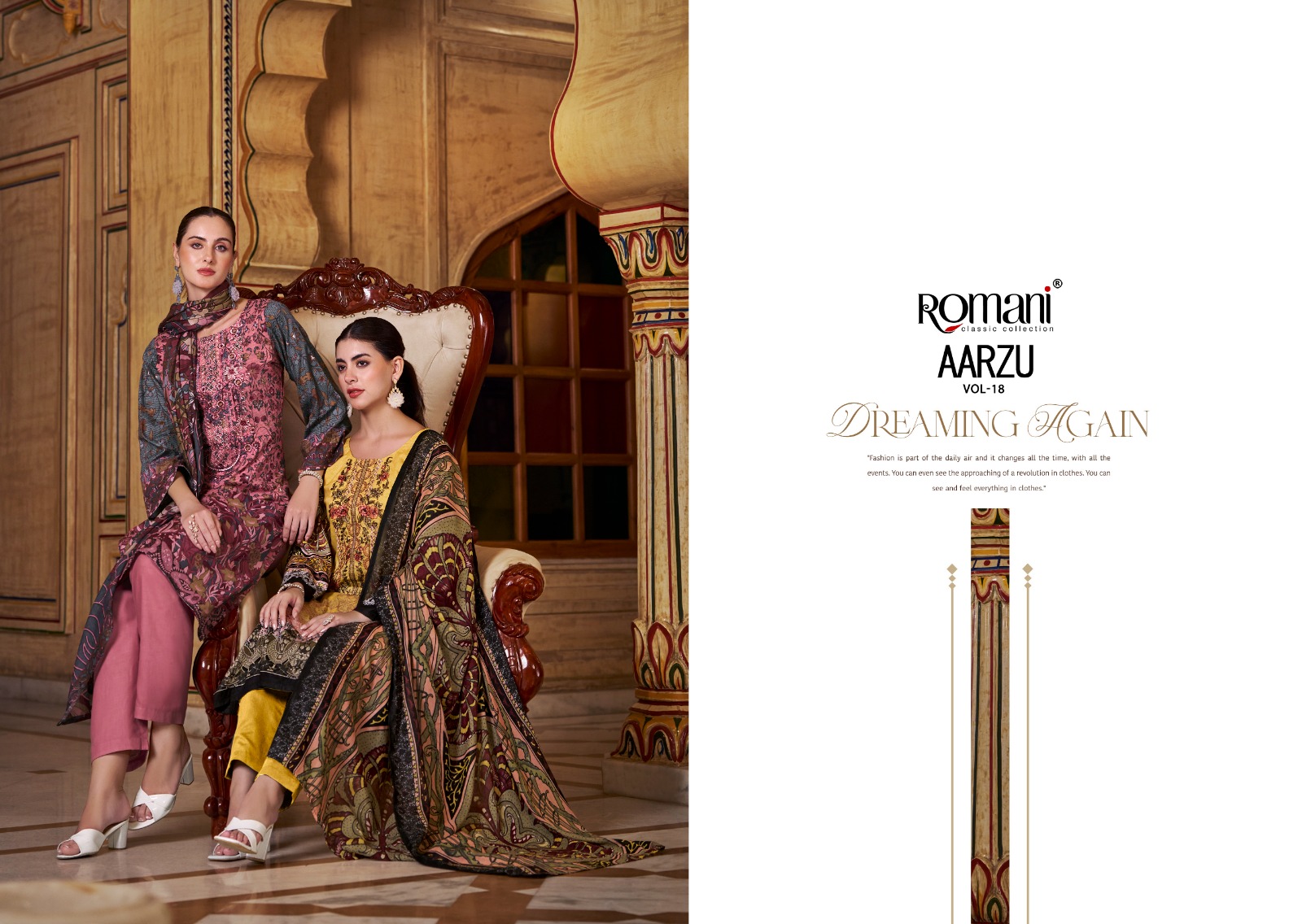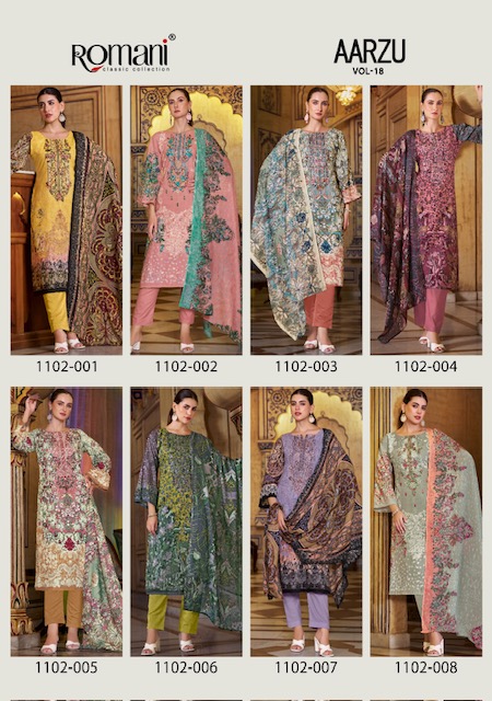 Whether you’re shopping for a festive celebration, a wedding function, or simply updating your ethnic wardrobe, the ROMANI AARZU VOL 18 collection promises to add an effortless charm to your look. With vibrant prints, luxurious fabrics, and intricately designed patterns, each suit tells a story of elegance and sophistication.